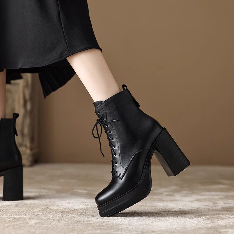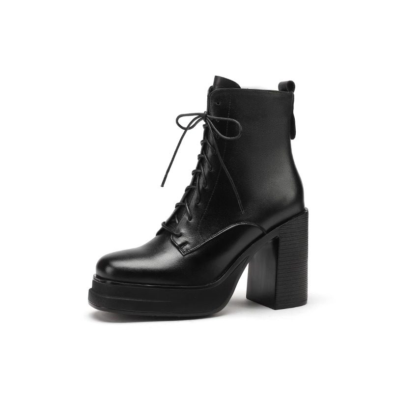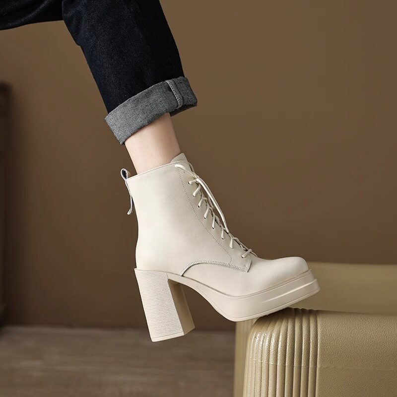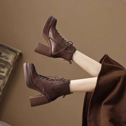 超高跟马丁靴女英伦风厚底粗跟短靴防水台系带复古棕色气质短筒靴