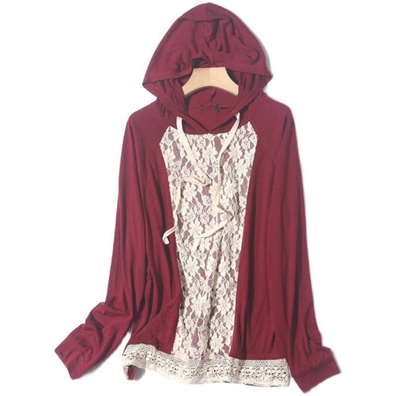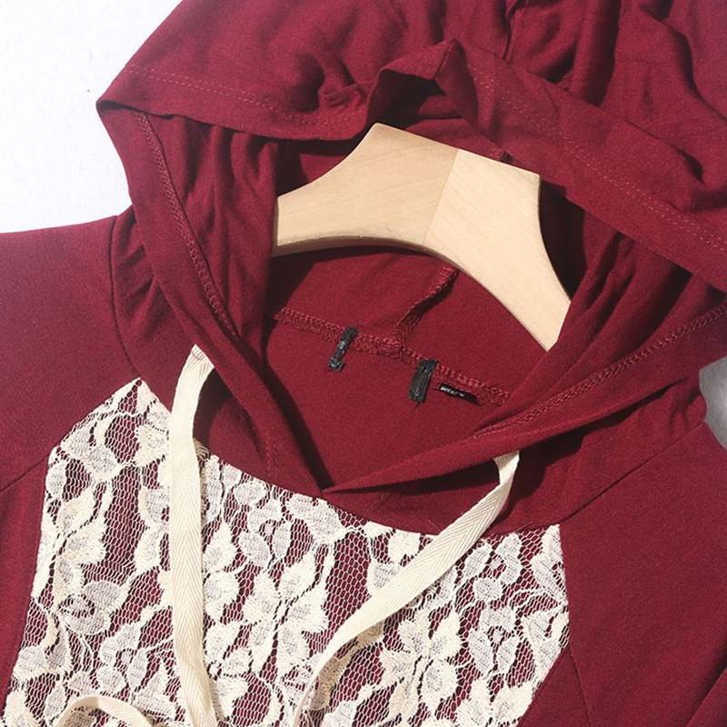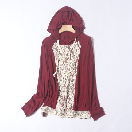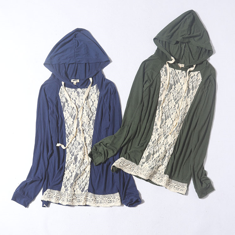 H50-3春秋女外贸单清新蕾丝拼接连帽T恤衫宽松休闲薄款长袖卫衣