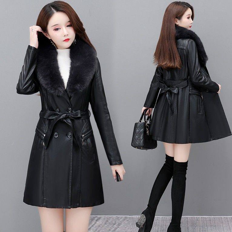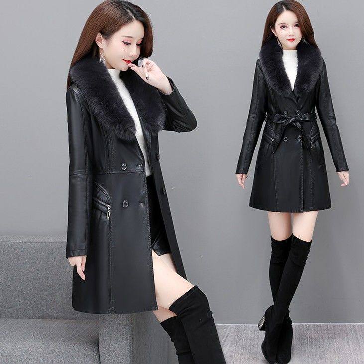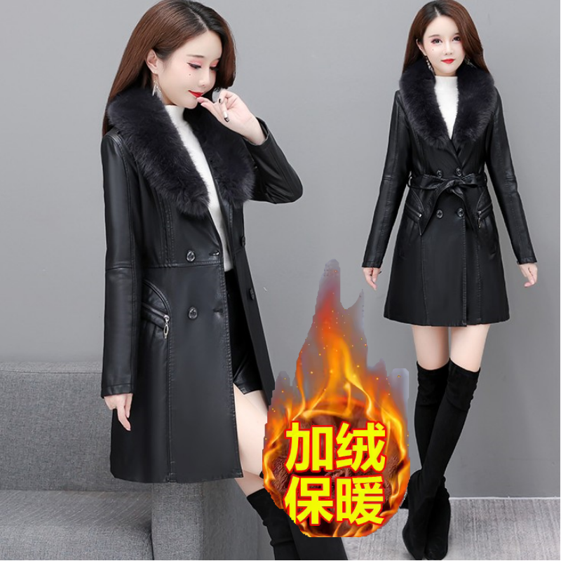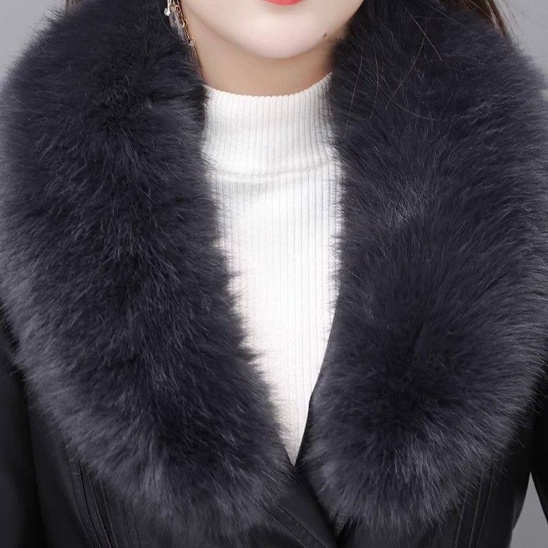 时尚皮衣女中长款加绒加厚2025新款大毛领秋冬修身小个子保暖外套