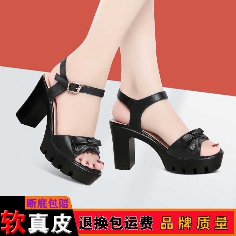 爆款粗跟厚底耐磨高跟走秀鞋夏季洋气时尚妈妈皮鞋一字带轻便凉鞋