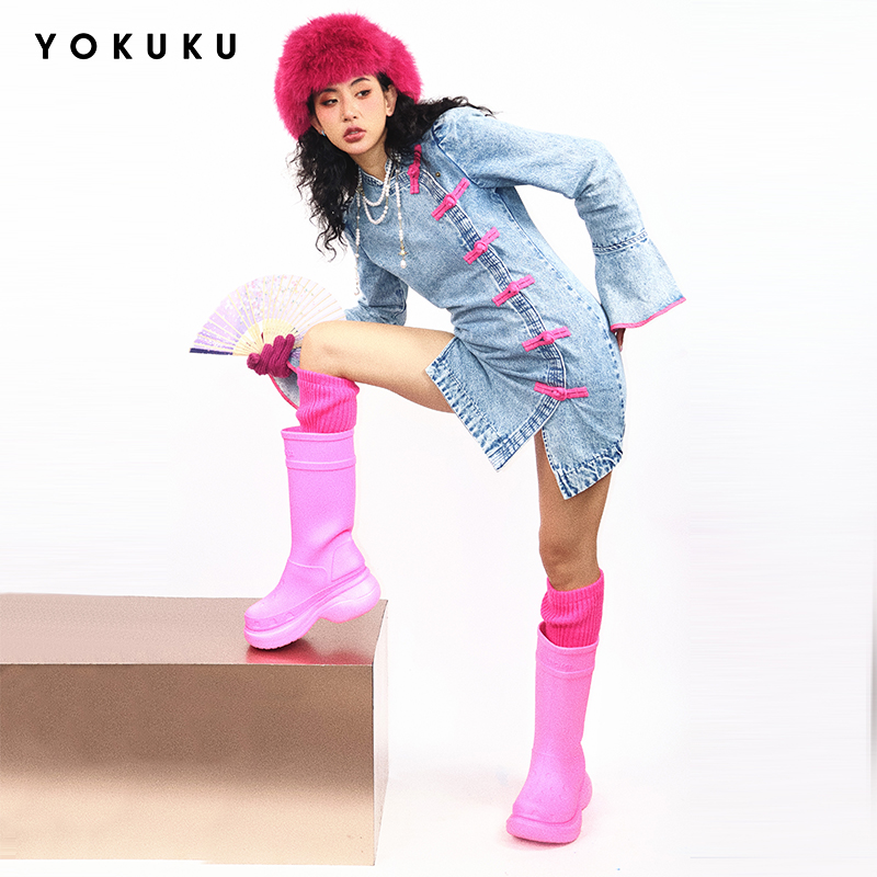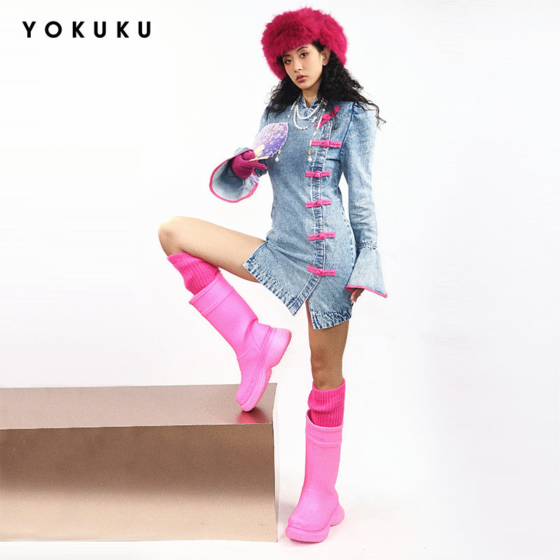 哟酷酷(福禄东方)新中式旗袍撞色连衣裙女马蹄扣修身显瘦牛仔裙