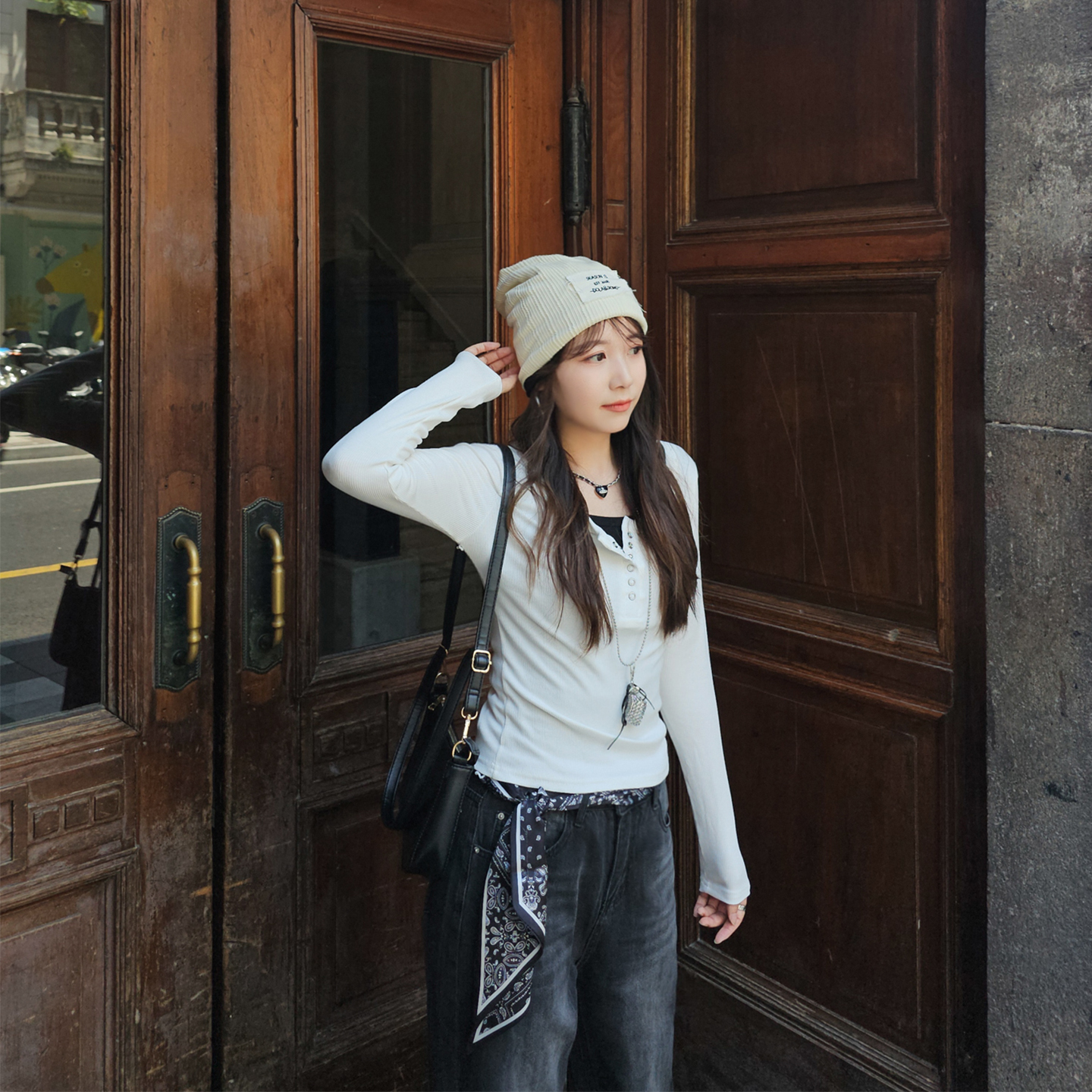 2025秋季纽扣打底衫新款修身纽扣都市风休闲别致圆领正肩t恤衫