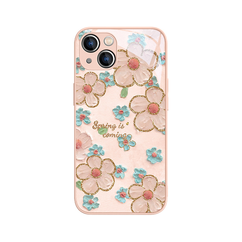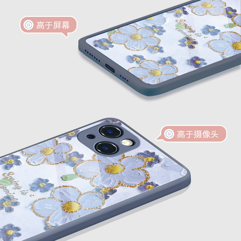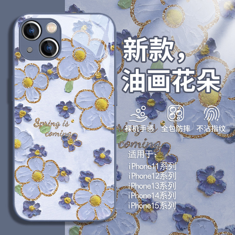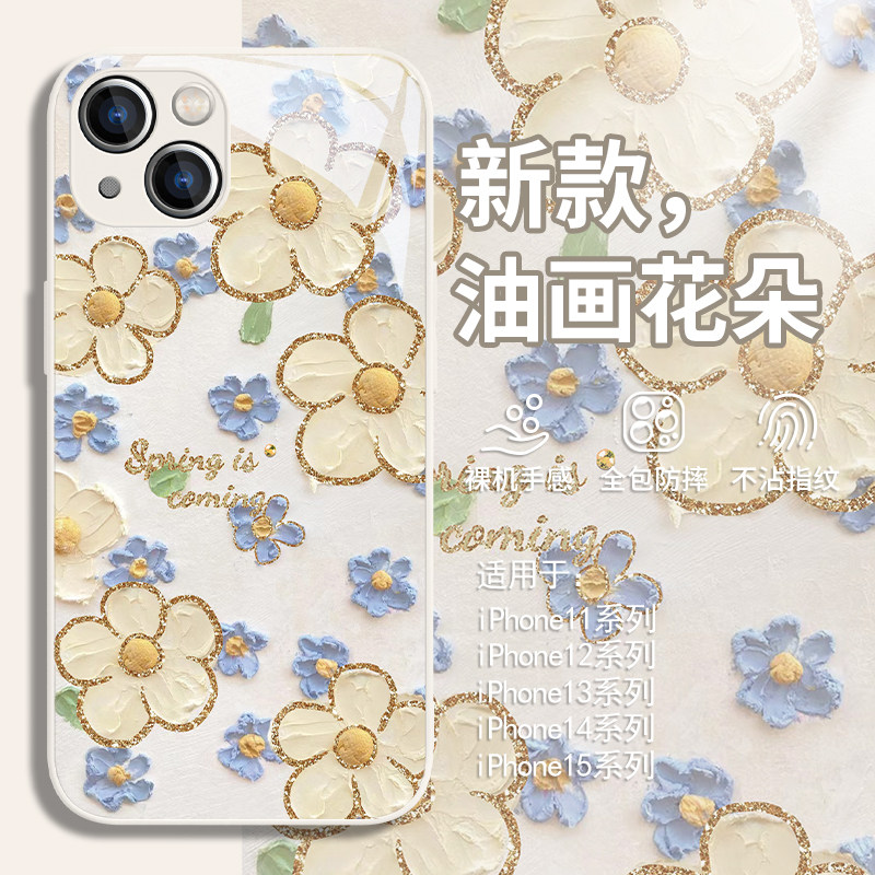 适用金边花朵苹果17promax手机壳iPhone14plus油画12mini个性13pro/15奢华11创意xsmax防摔xr高级感8plus玻璃
