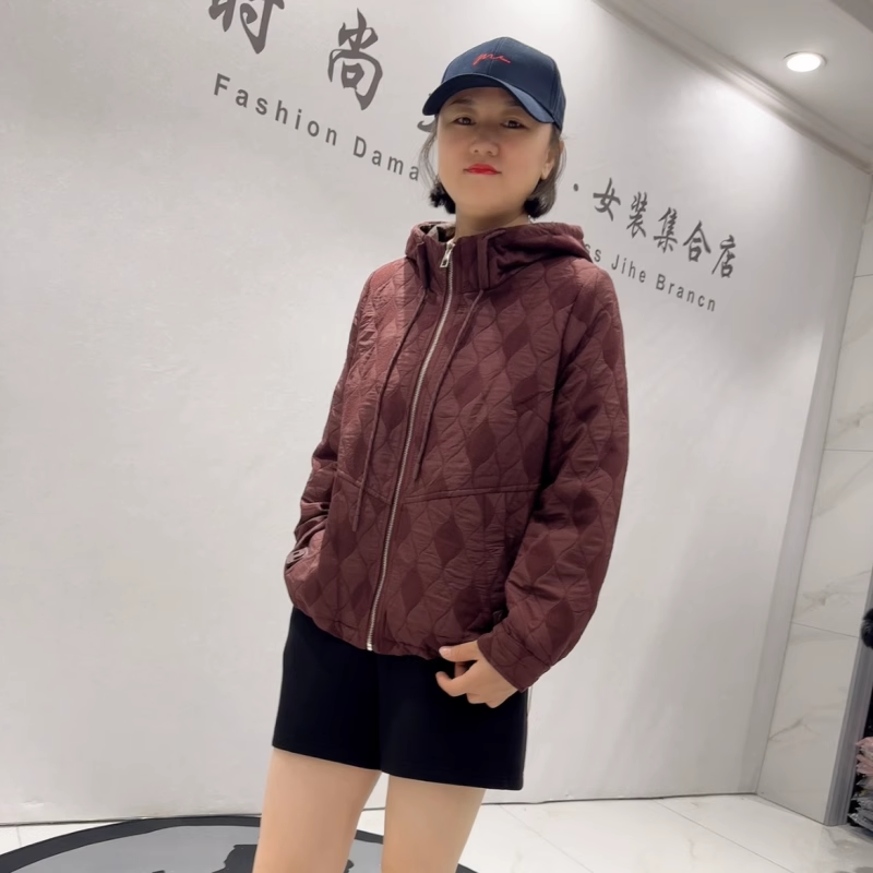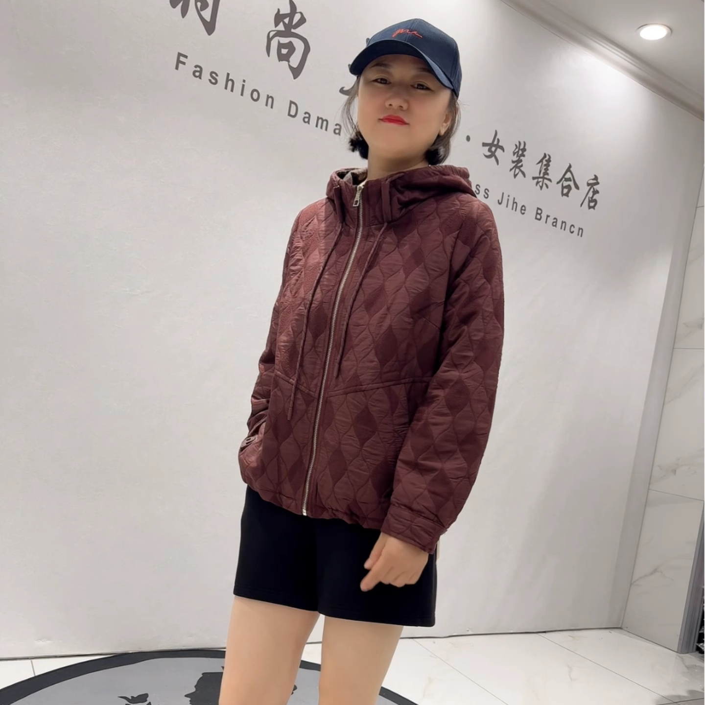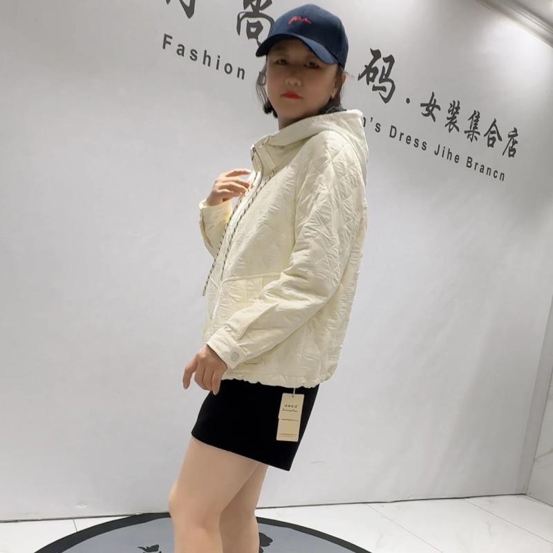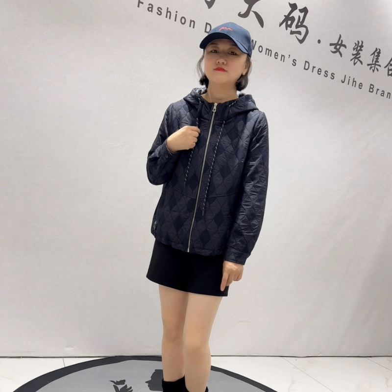 芮娜依莲9683初冬新品韩国面料拼接格子可抽绳薄棉外套加大码女装