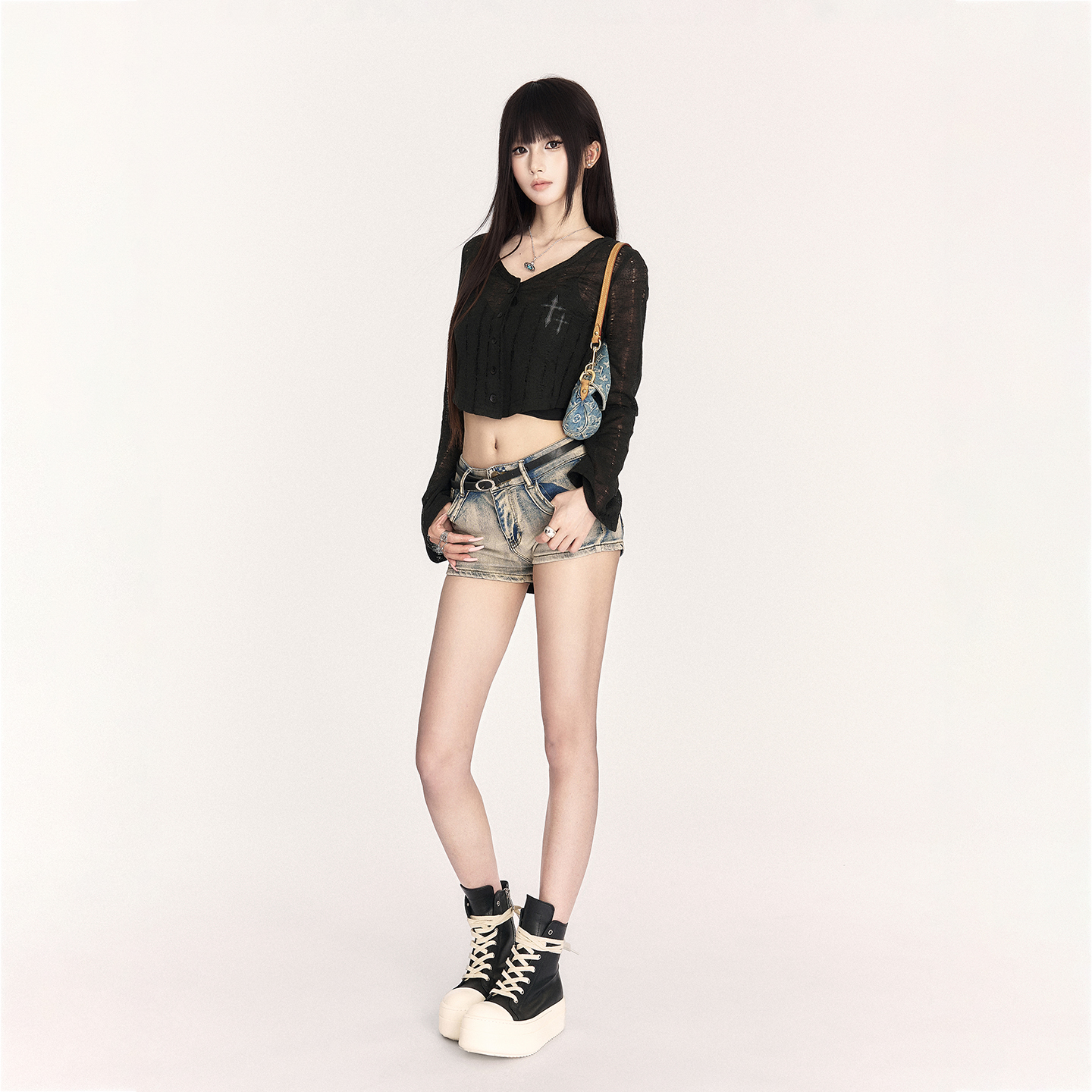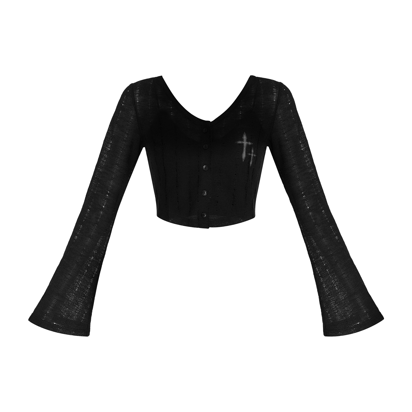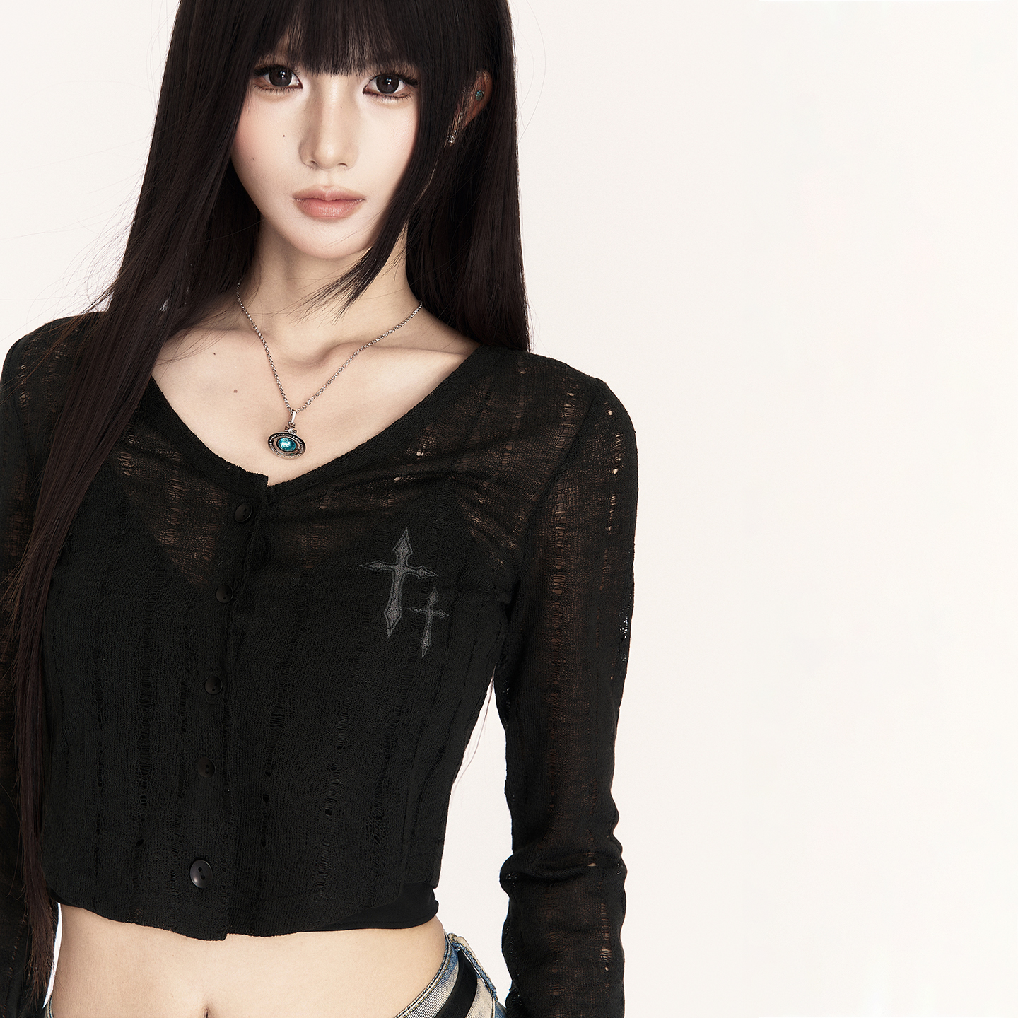 VOCK 初代辣妹 百搭显瘦十字架微透坑条针织开衫短款外搭罩衫上衣