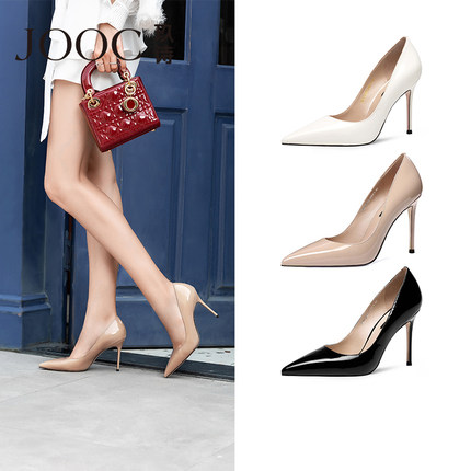 JOOC玖诗漆皮高跟鞋经典纯色百搭女鞋尖头细高跟单鞋浅口OL风女鞋