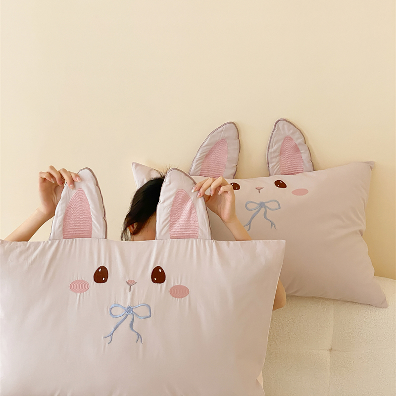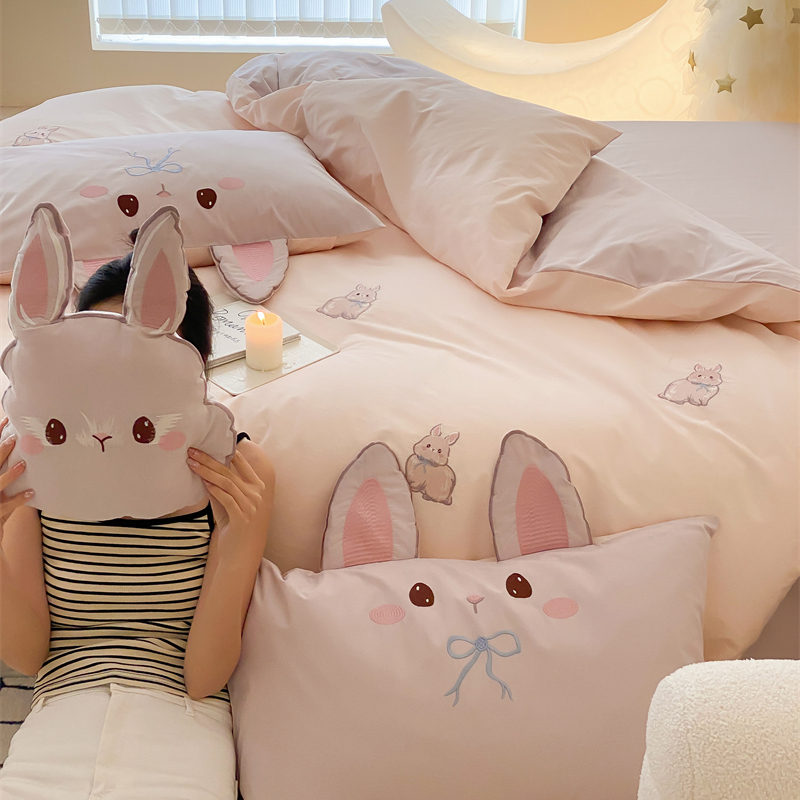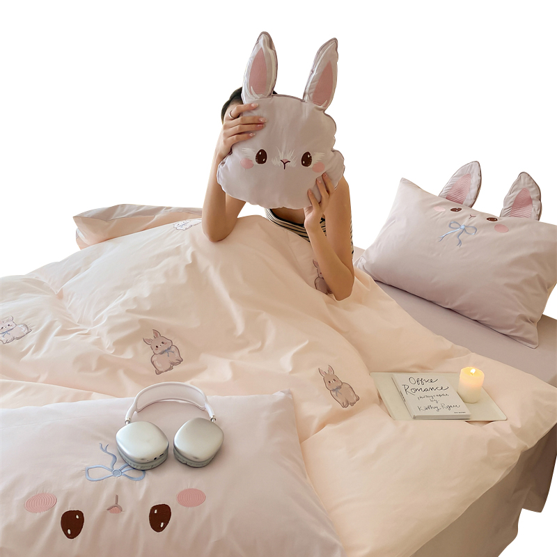 送抱枕粉嫩小兔叽水洗棉床上四件套1.5m1.8公寓全棉床单被套少女