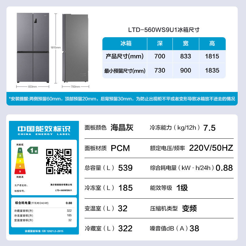 焕新补| 海尔电冰箱大容量539升十字四门家用无霜Leader560一级