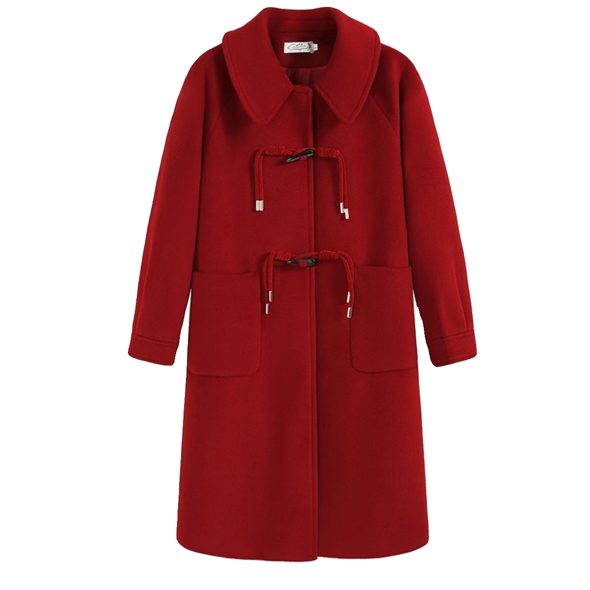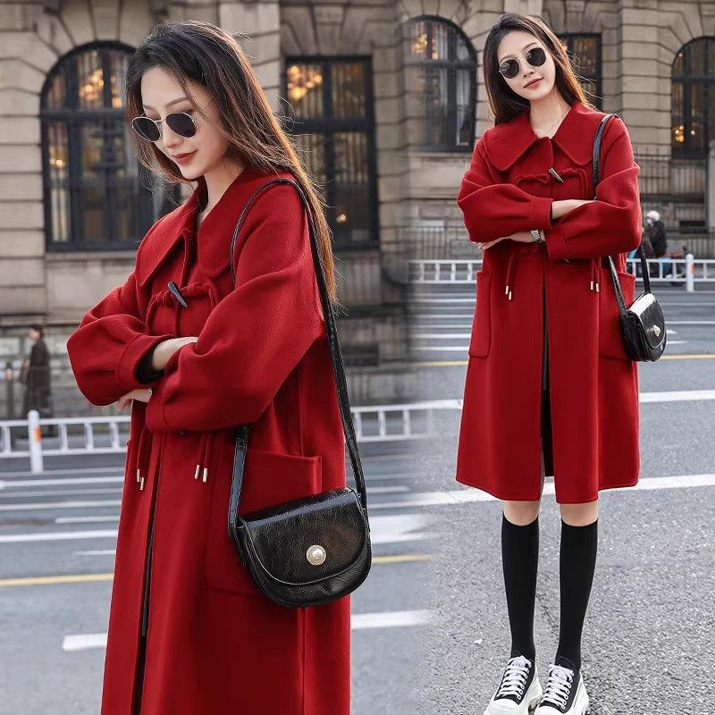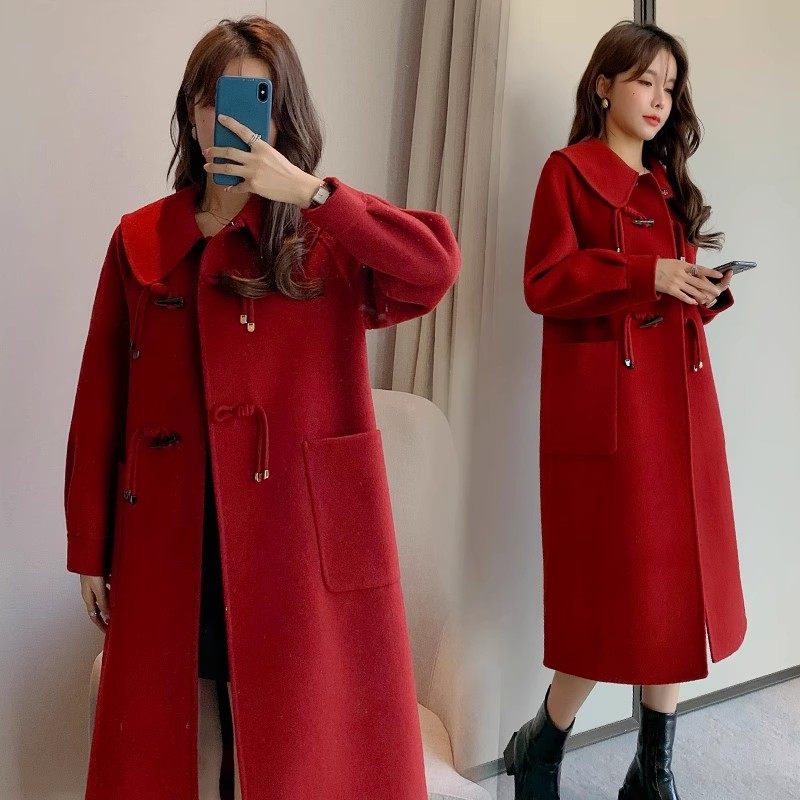 胖mm大码高级感毛呢大衣女牛角扣中长款小香风红色呢子外套200斤