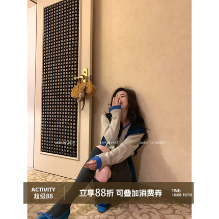 大于诗集 巴黎课间 假两件针织开衫女垫肩外套短款撞色V领上衣冬
