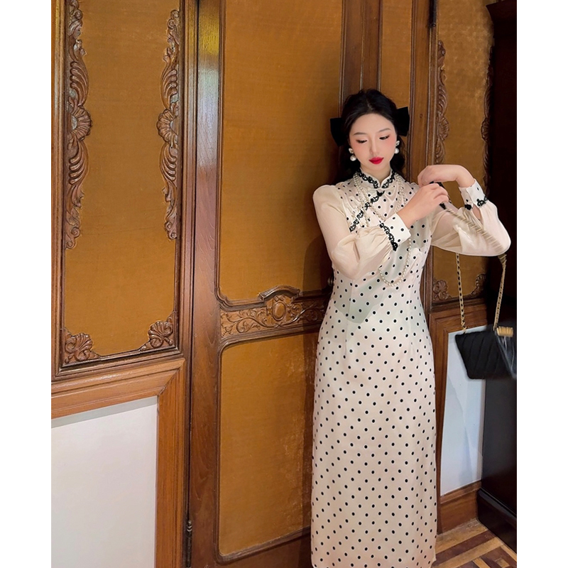 麓津自制《茶白珍珠》民国复古波点改良款米白色旗袍裙子长袖少女