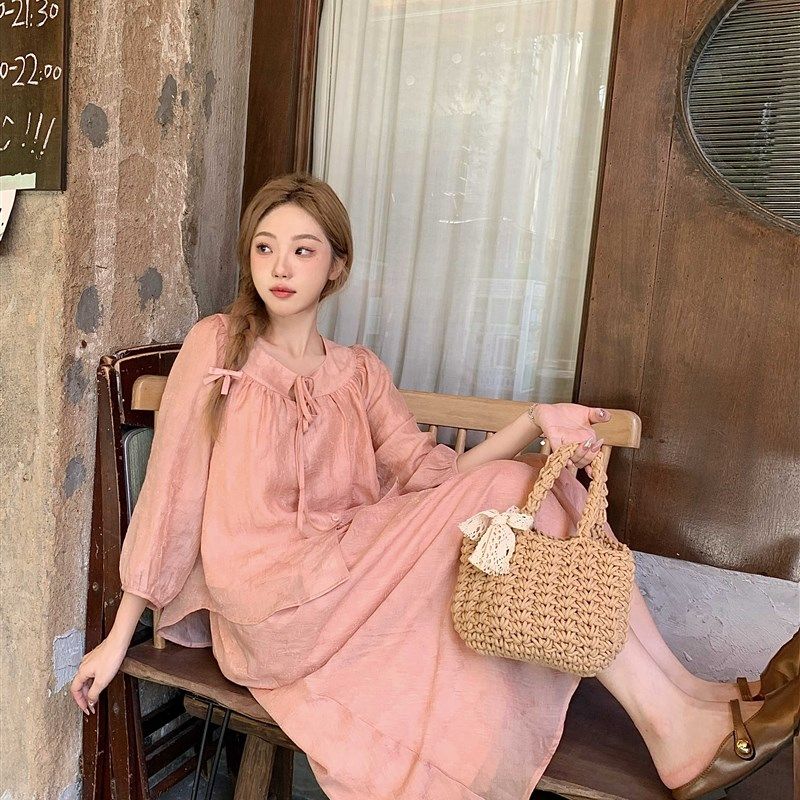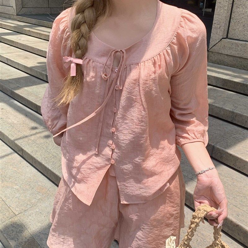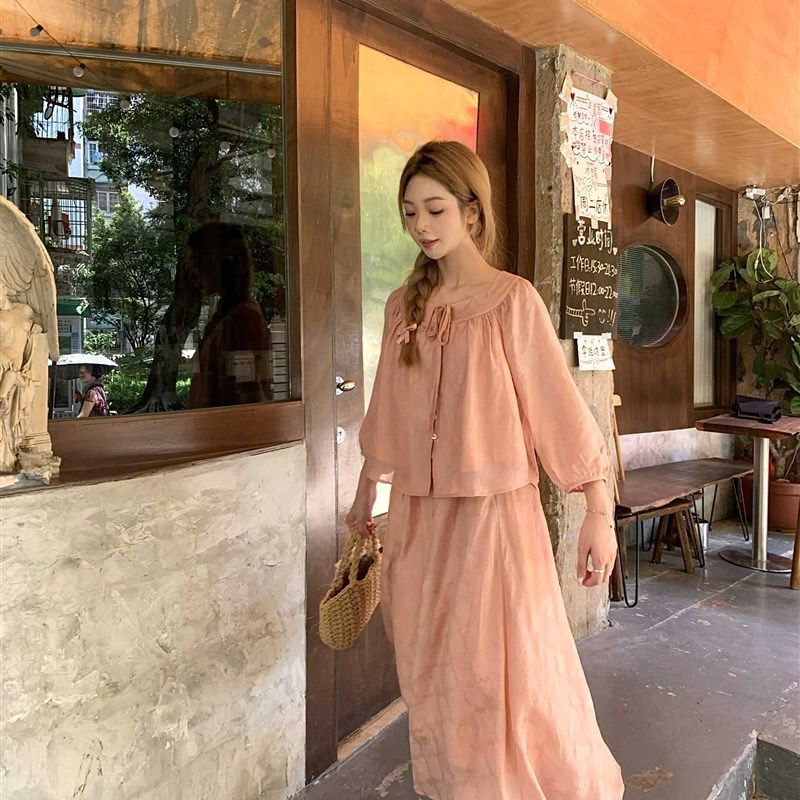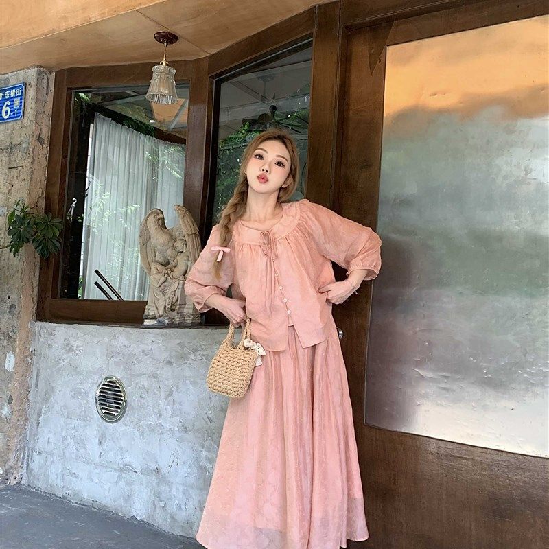 2024夏季新中式小个子套装圆领防晒衬衫上衣半裙长裙粉色两件套女