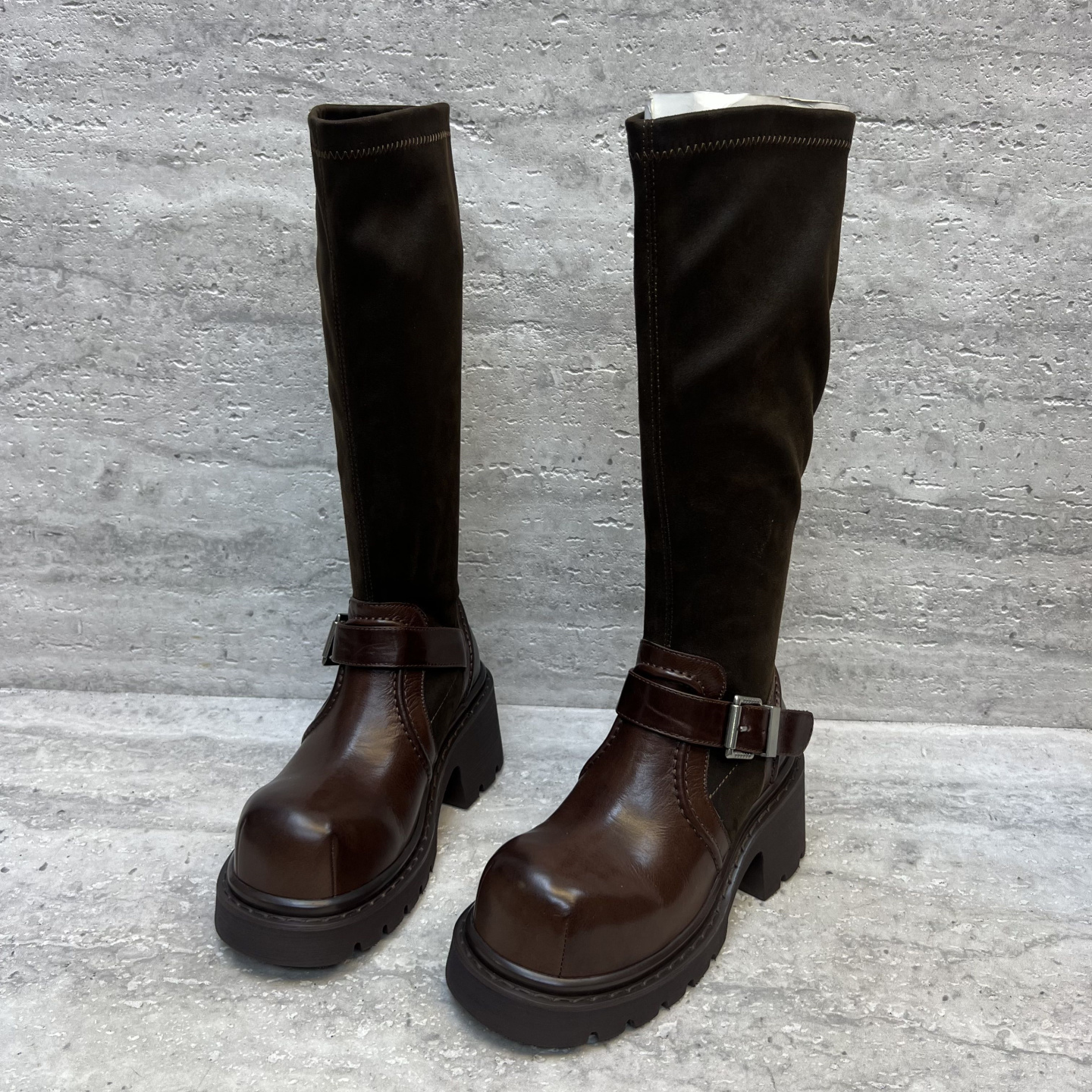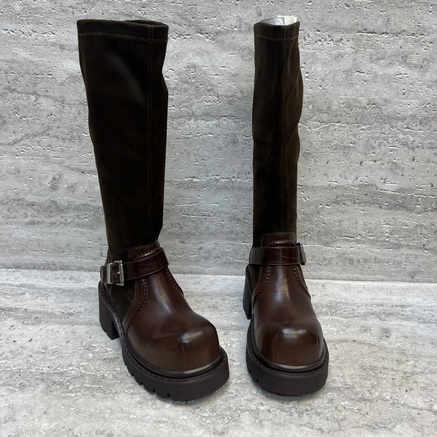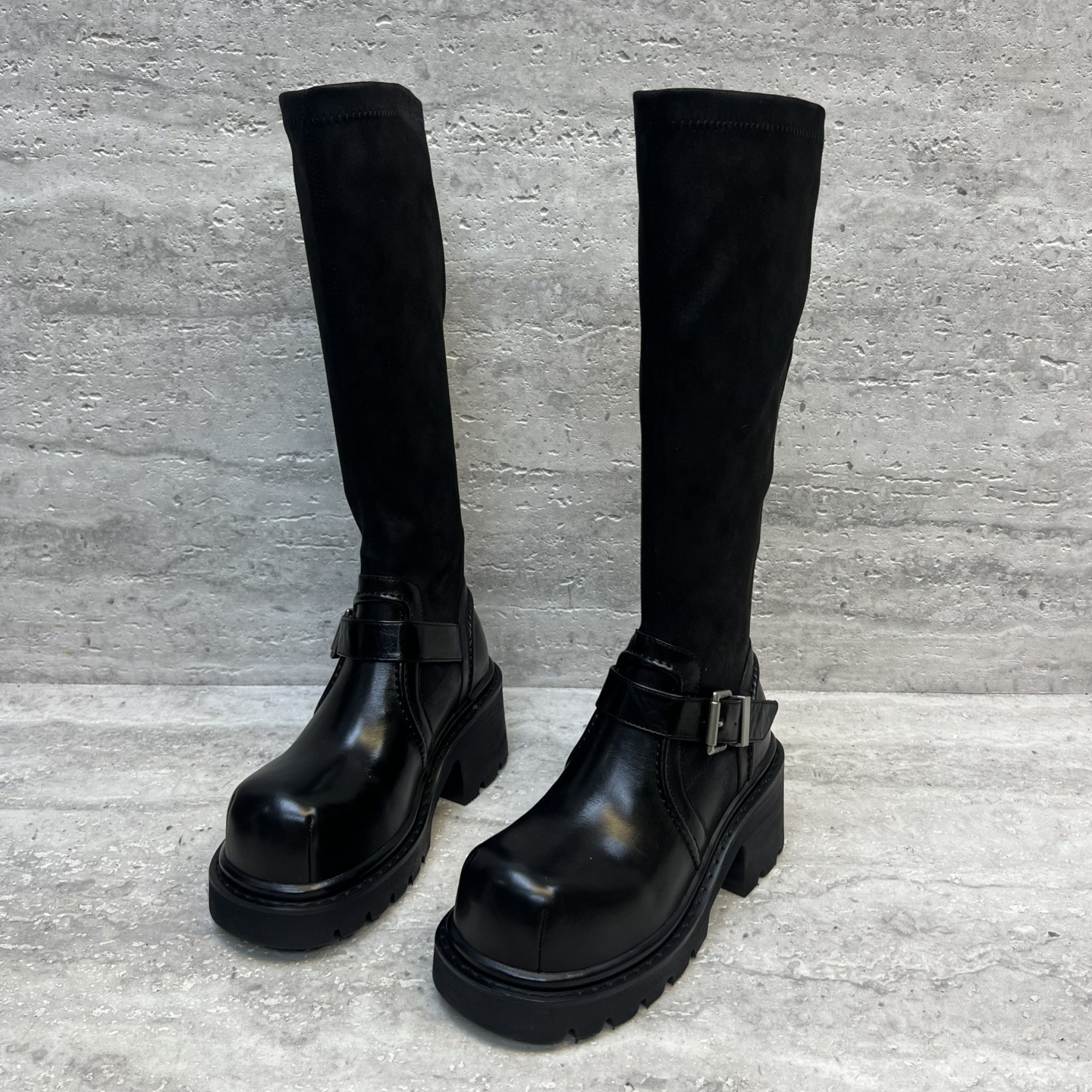 乐魔女鞋2025秋季新款欧货真皮弹力布粗跟皮带扣套筒骑士靴长靴女