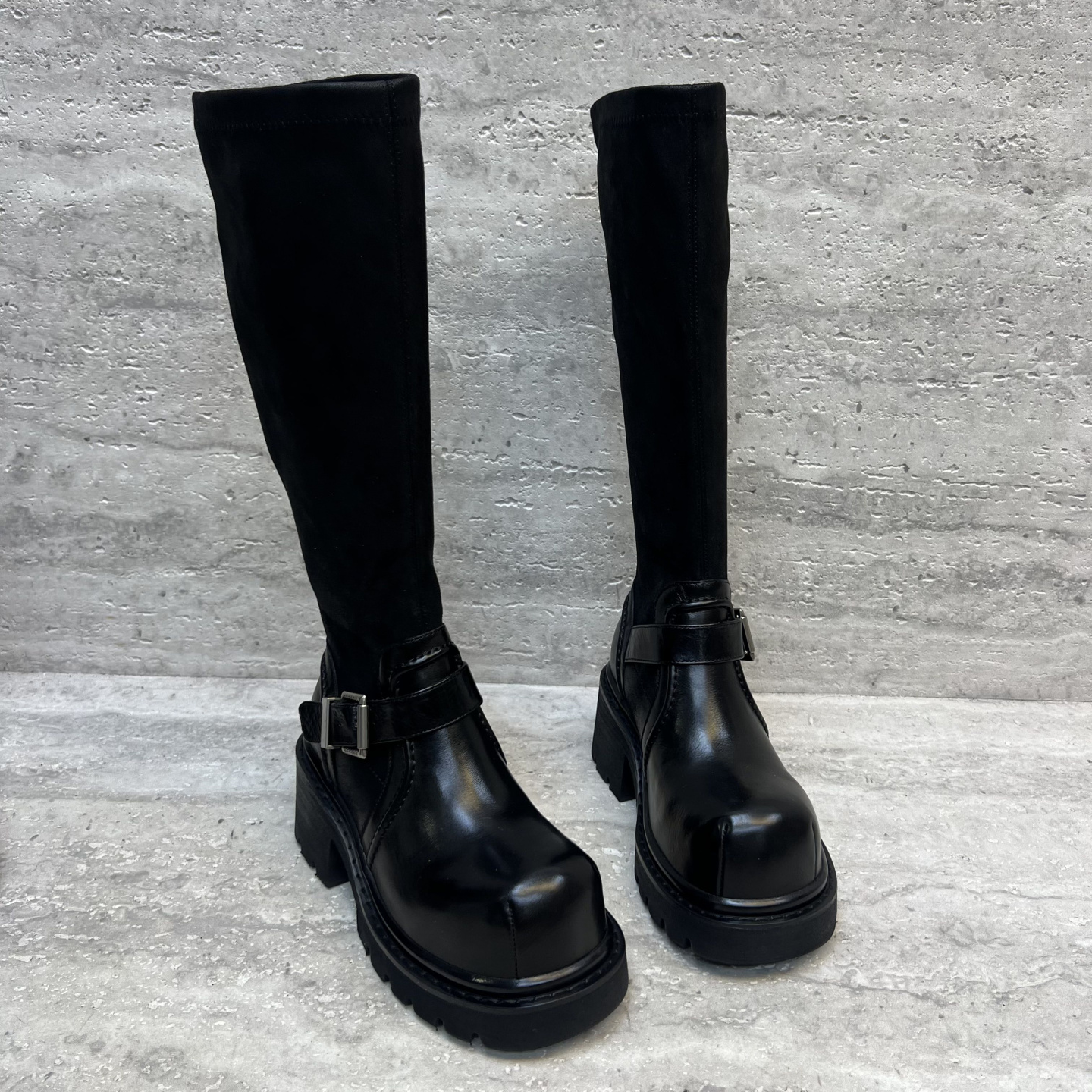 弹力布粗跟皮带扣套筒骑士靴长靴