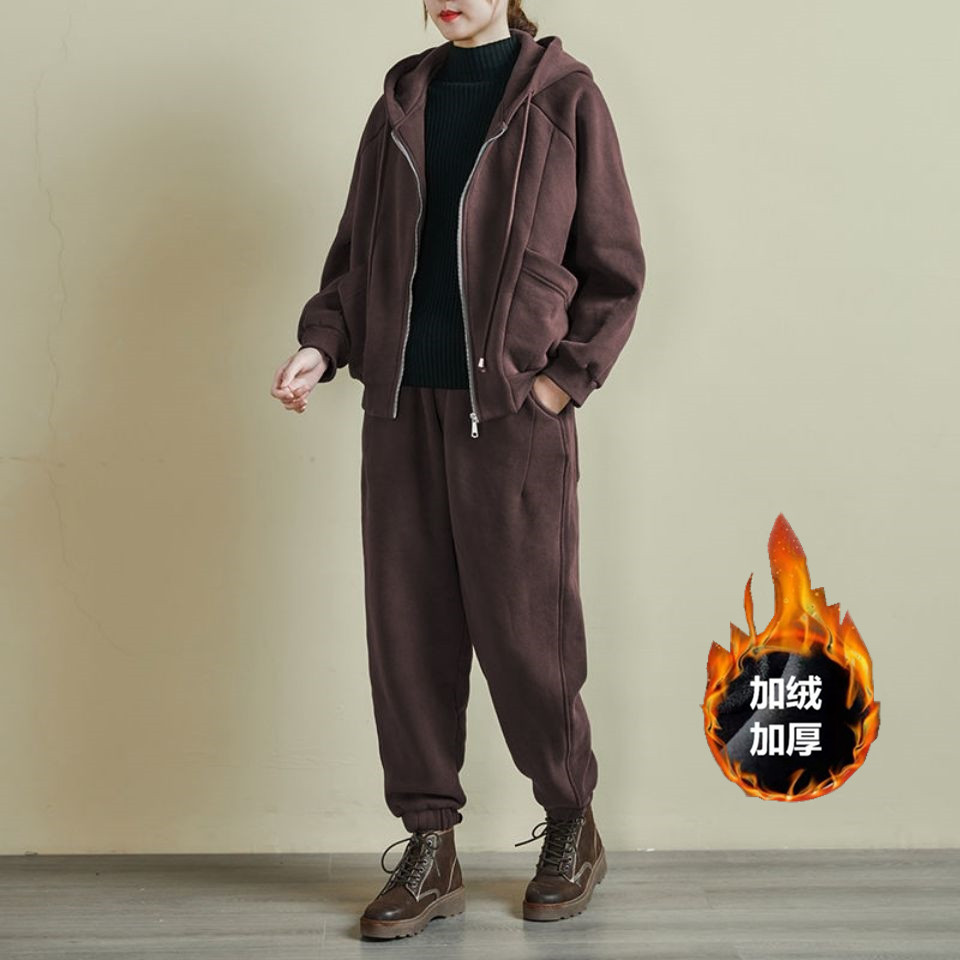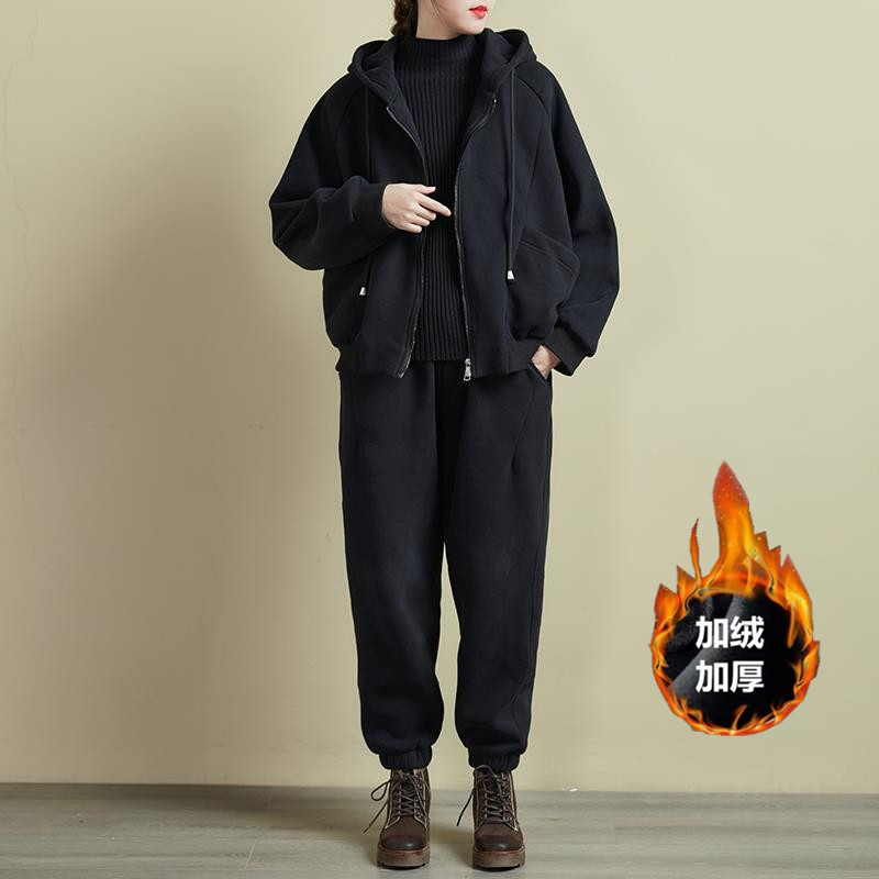 2025年加绒加厚运动套装女秋冬季大码宽松时尚连帽卫衣休闲服两件