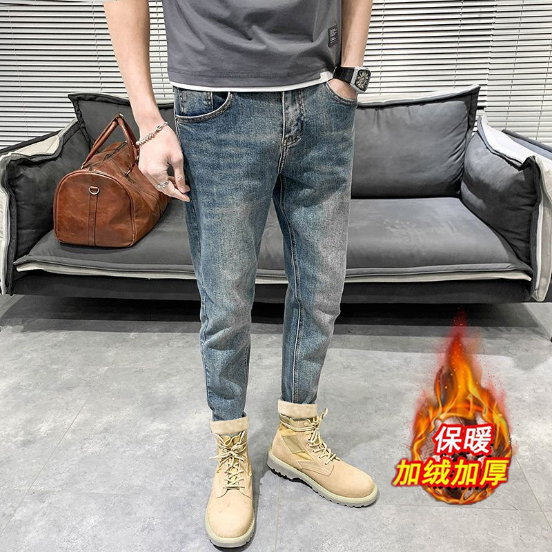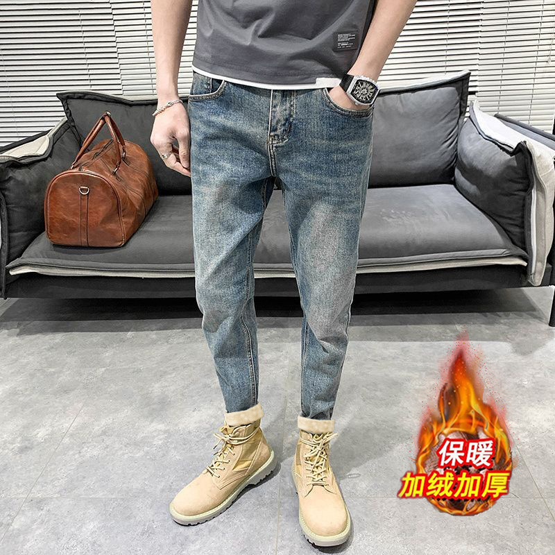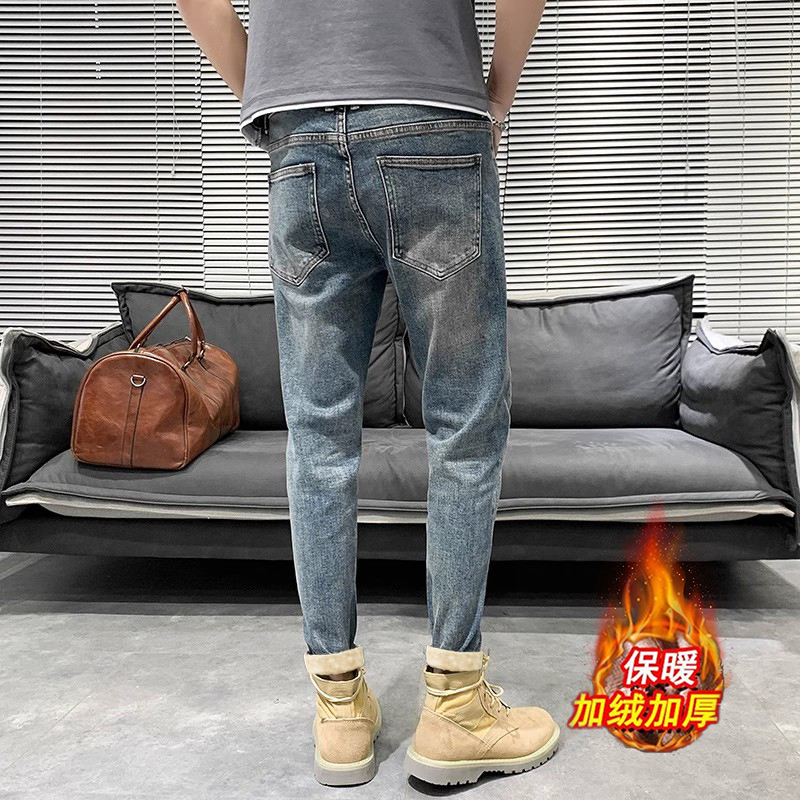 新百伦冬季厚款男士复古牛仔裤2025新款修身九分弹力直筒男款长裤