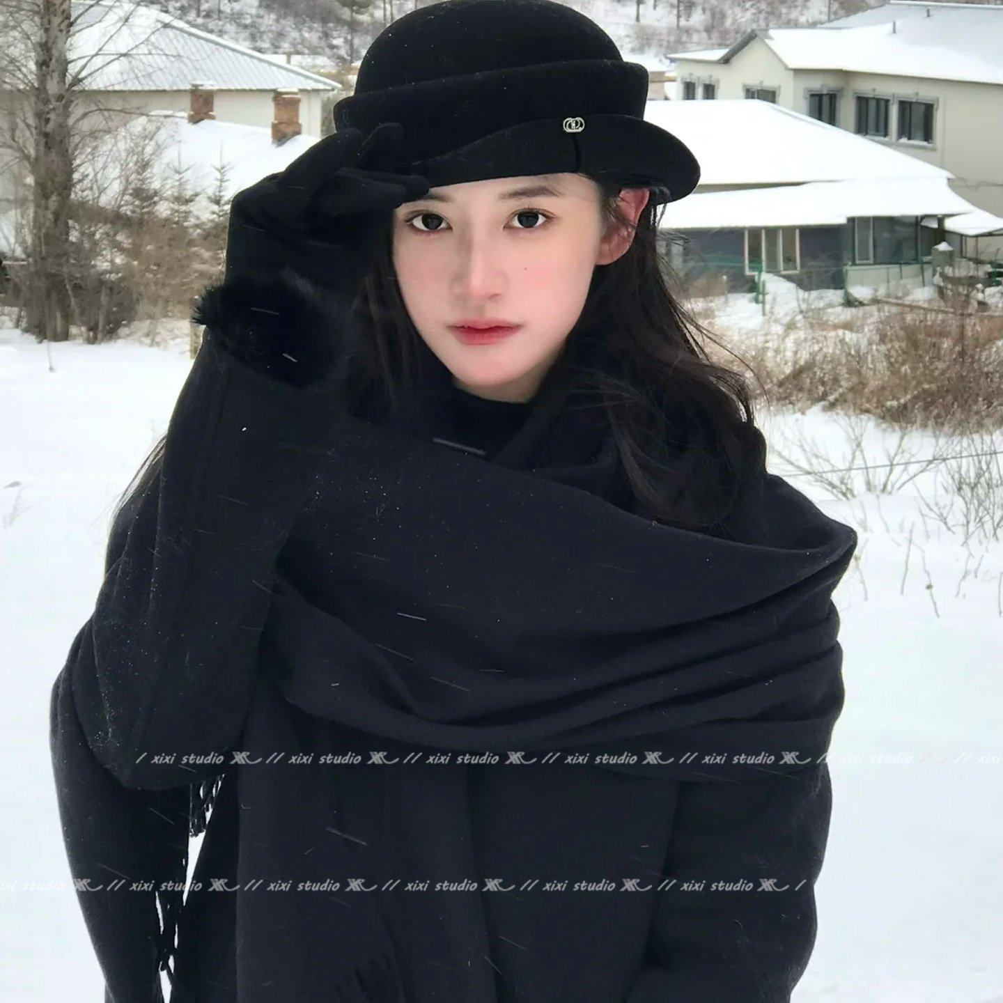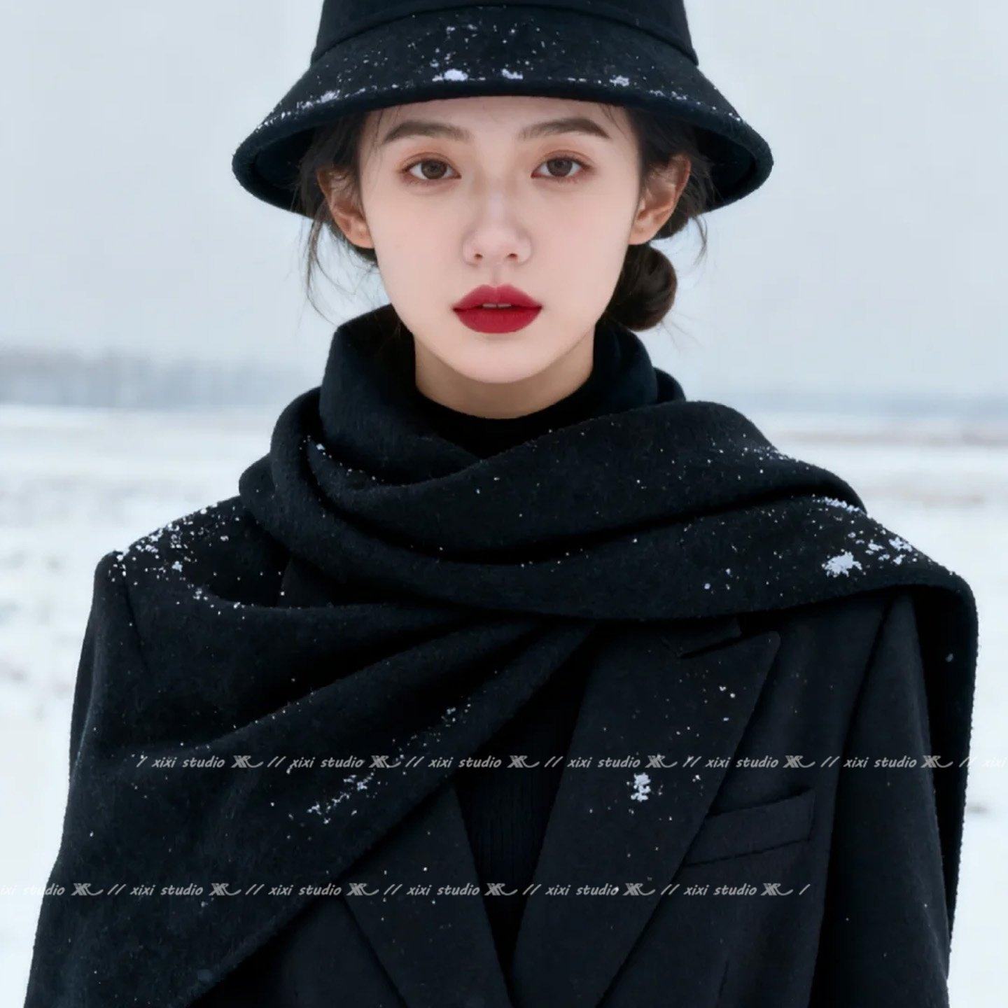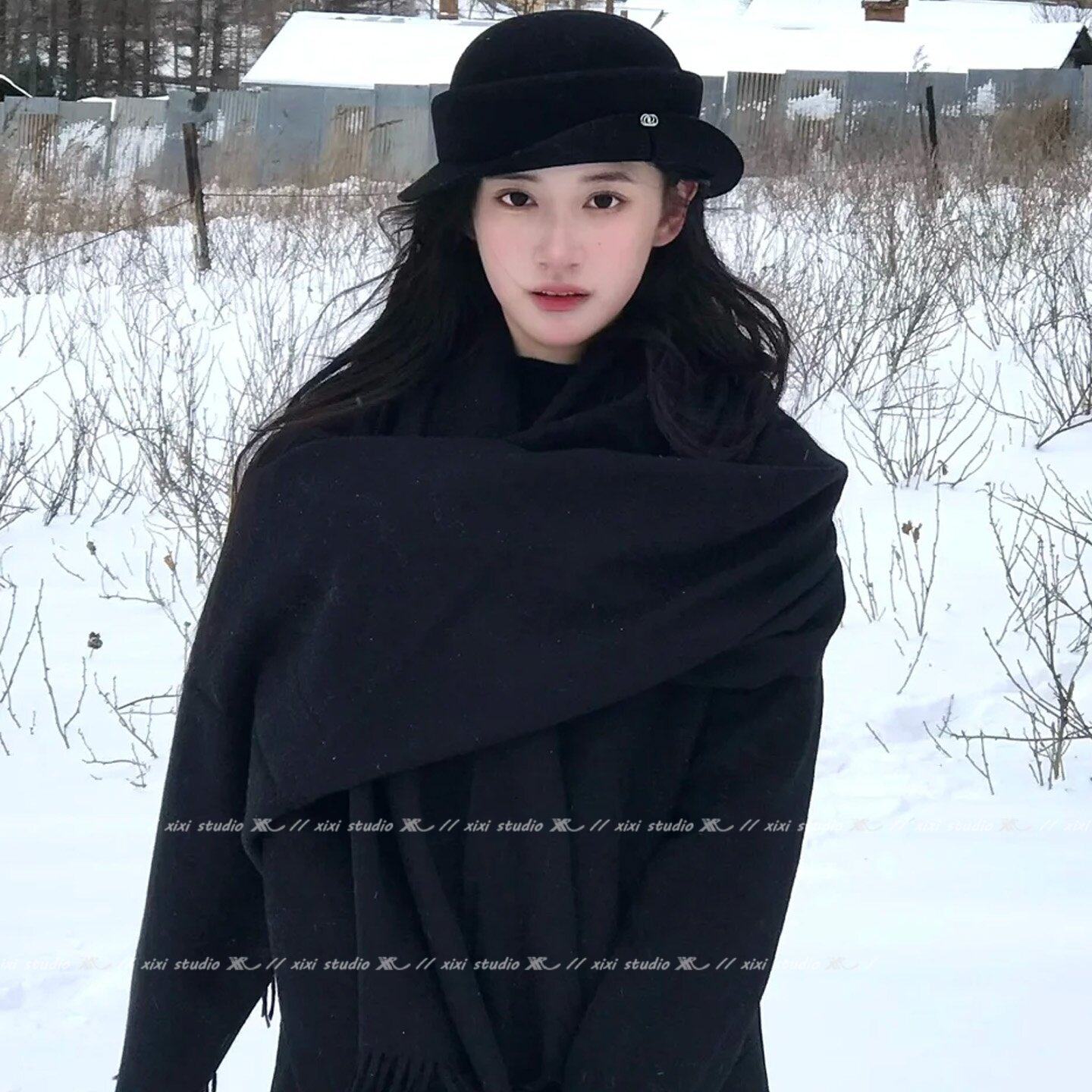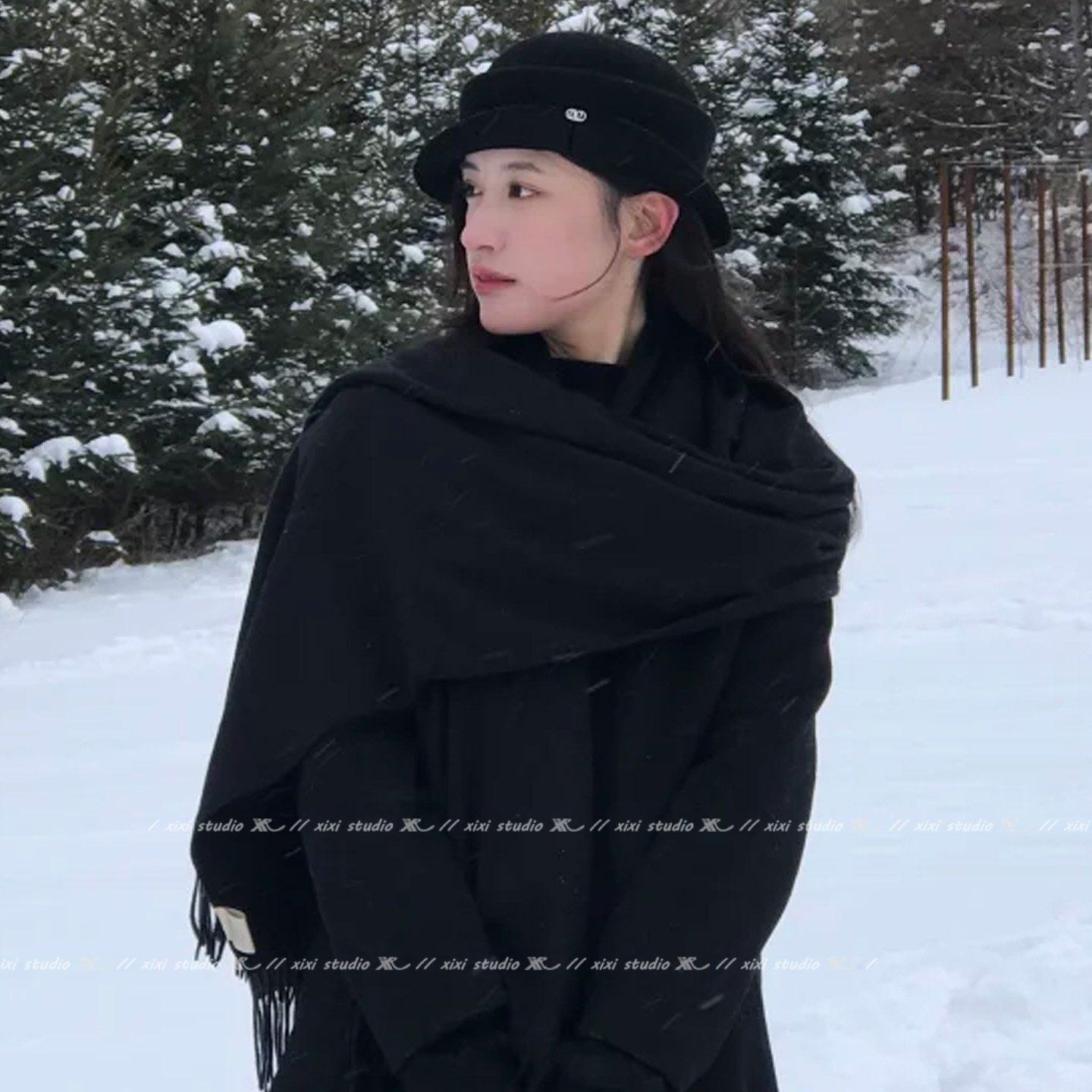 黑色高级仿羊绒毛线柔软围巾纯色保暖流苏围脖独特漂亮披肩新品女