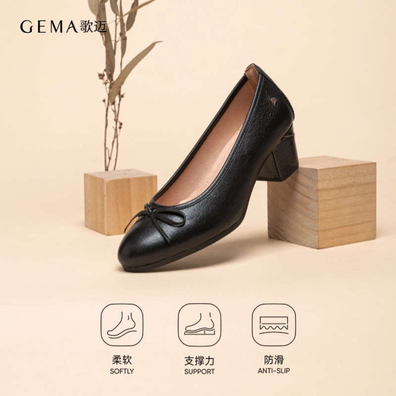 歌迈女鞋单鞋女软皮软底工作不累脚粗跟黑色浅口真皮鞋复古高跟鞋