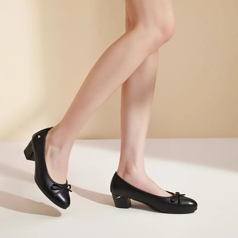 软皮蝴蝶结通勤风粗跟单鞋黑色