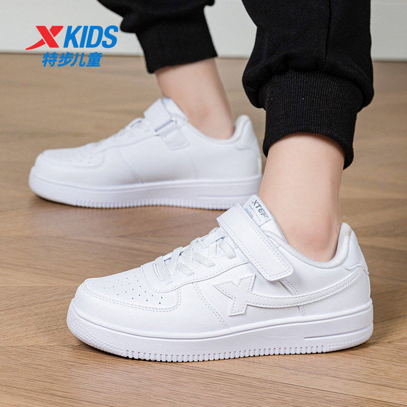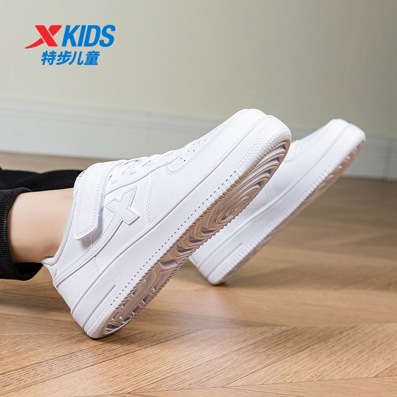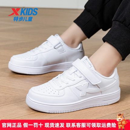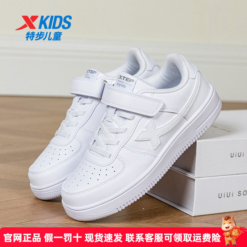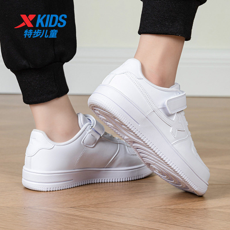 特步童鞋官方新款男童小白鞋儿童女童白色低帮皮面板鞋大童运动鞋