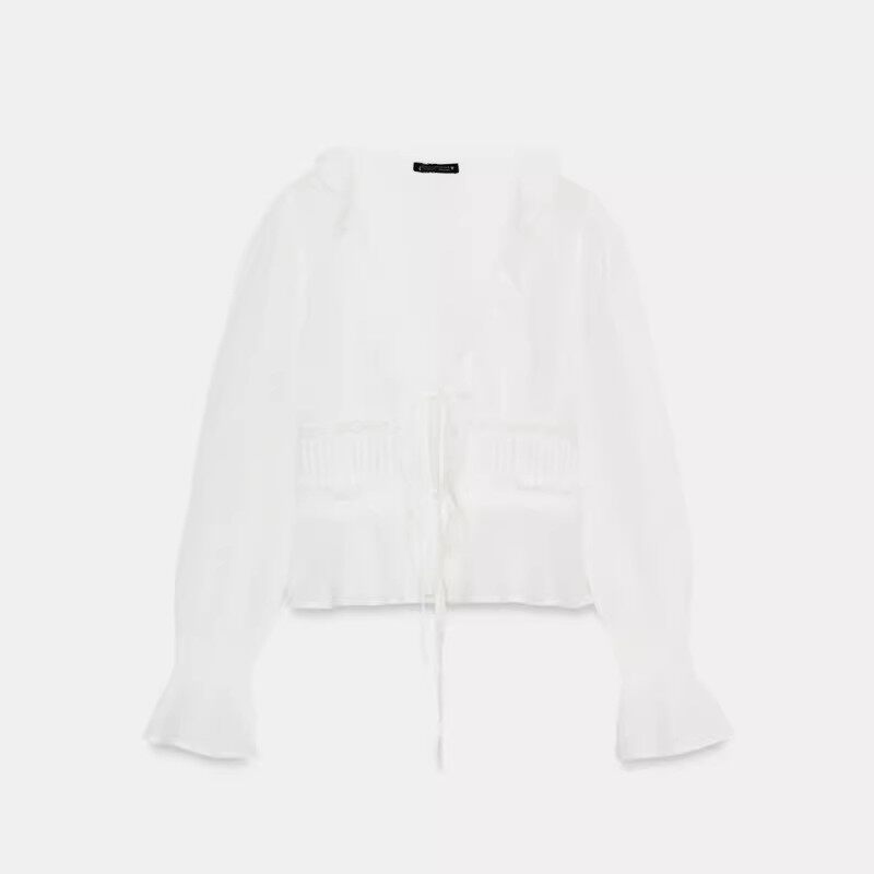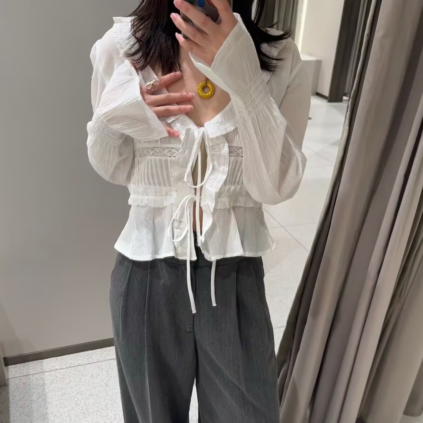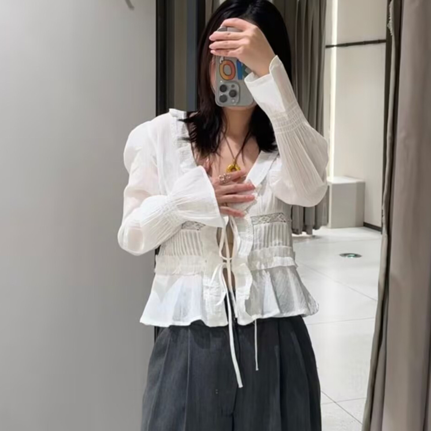 2026春夏新品法式甜美V领薄纱刺绣修身系带叠层装饰衬衫女0881016