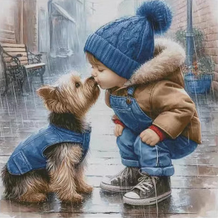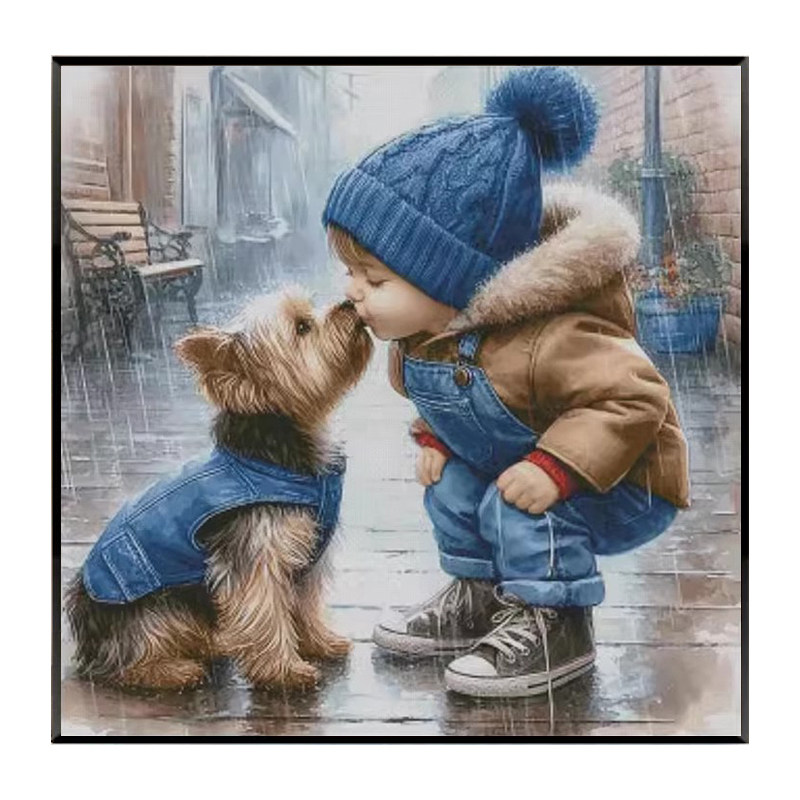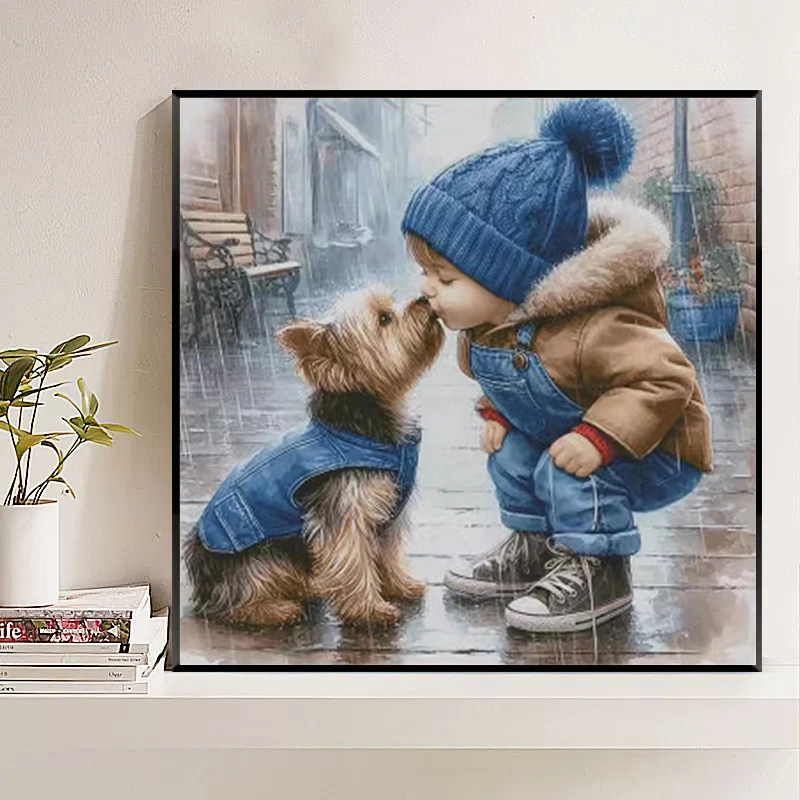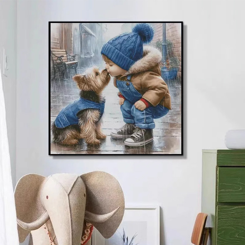 新款十字绣线绣客厅温馨亲吻可爱小孩与狗卧室儿童房钻石贴画手工