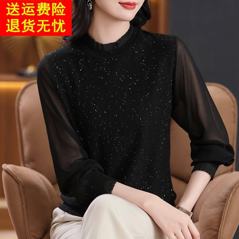 蕾丝边桑蚕丝针织衫针织衫女春秋装薄款妈妈冰丝上衣遮肚子打底衫