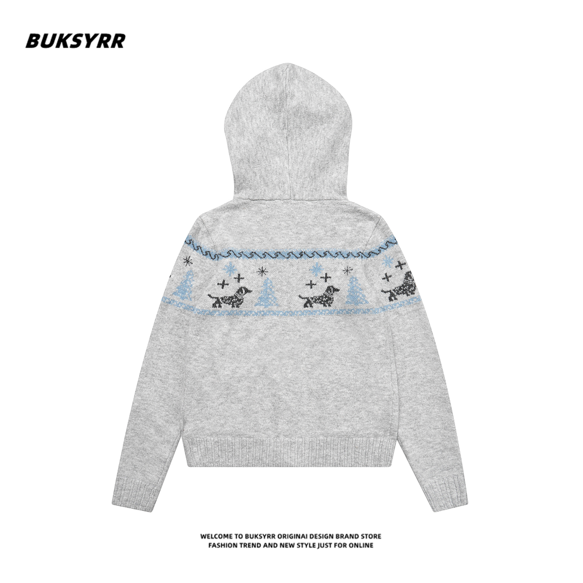 BUKSYRR美式小狗提花开衫连帽毛衣外套女秋冬甜美修身显瘦针织衫