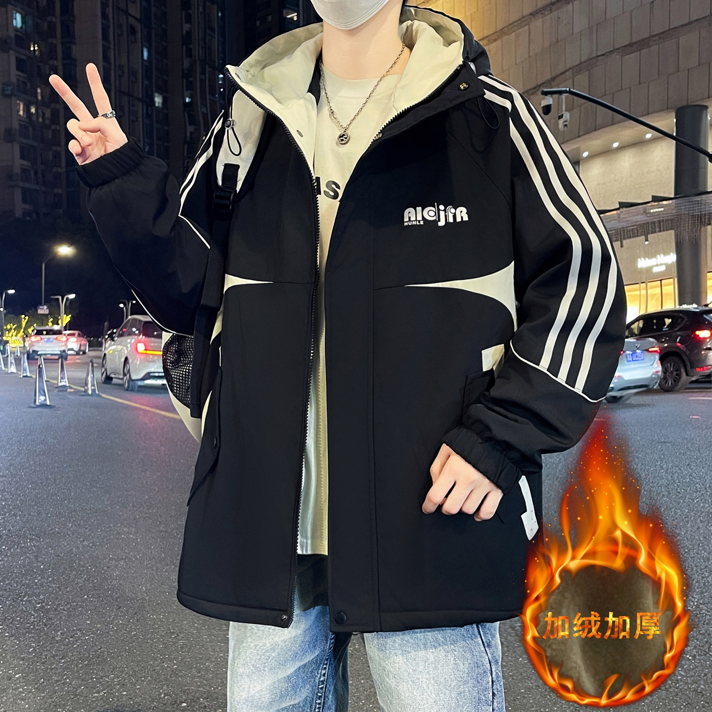 加绒冲锋衣夹克男款冬季连帽保暖外套装上衣撞色拼接工装棉服以純