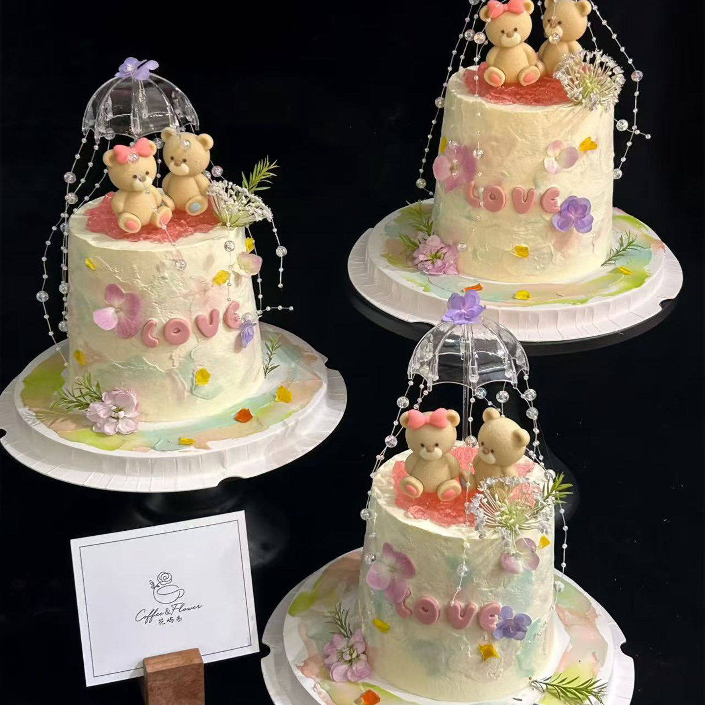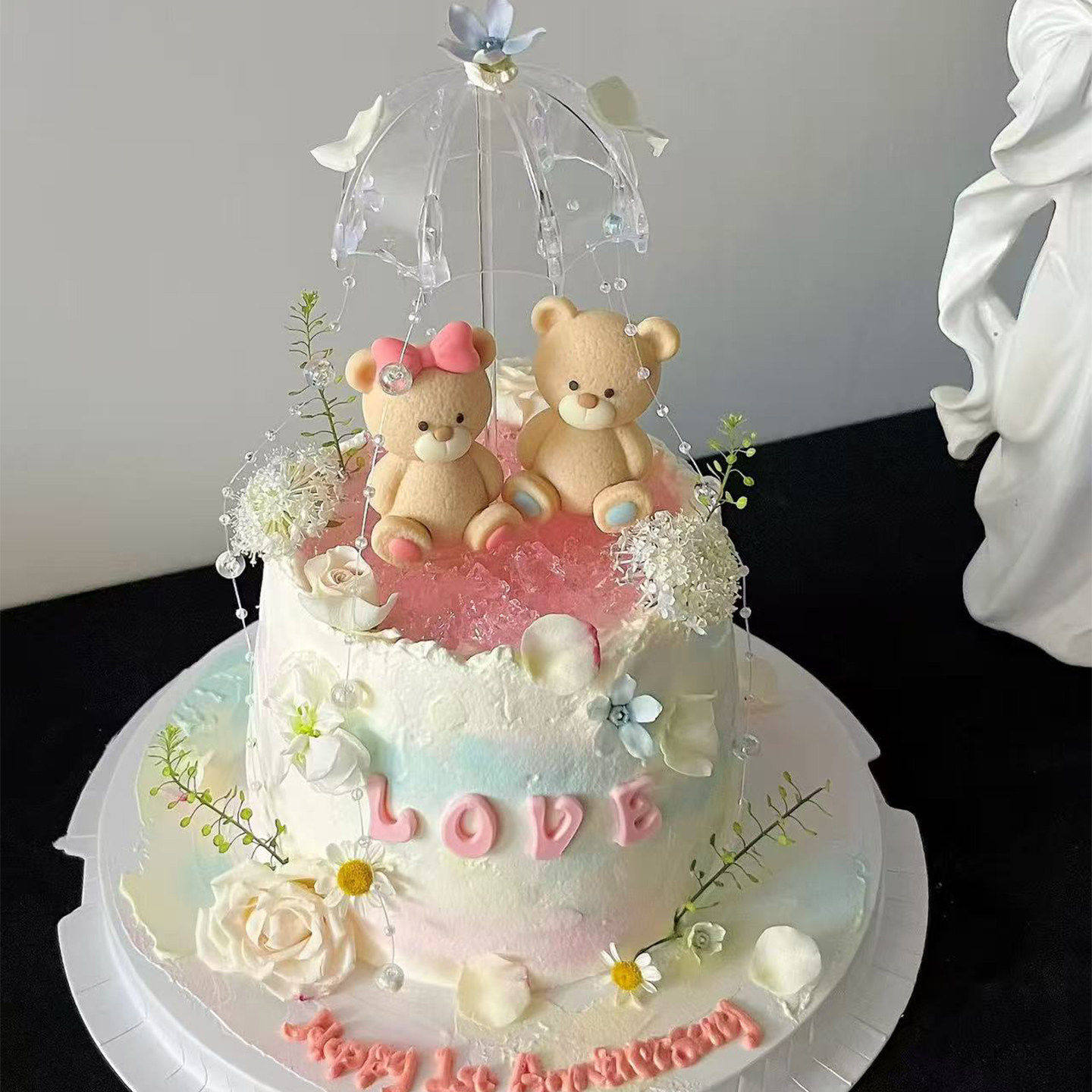 2.14情人节坐姿小熊蛋糕装饰摆件透明小雨伞情侣表白节日烘焙装扮