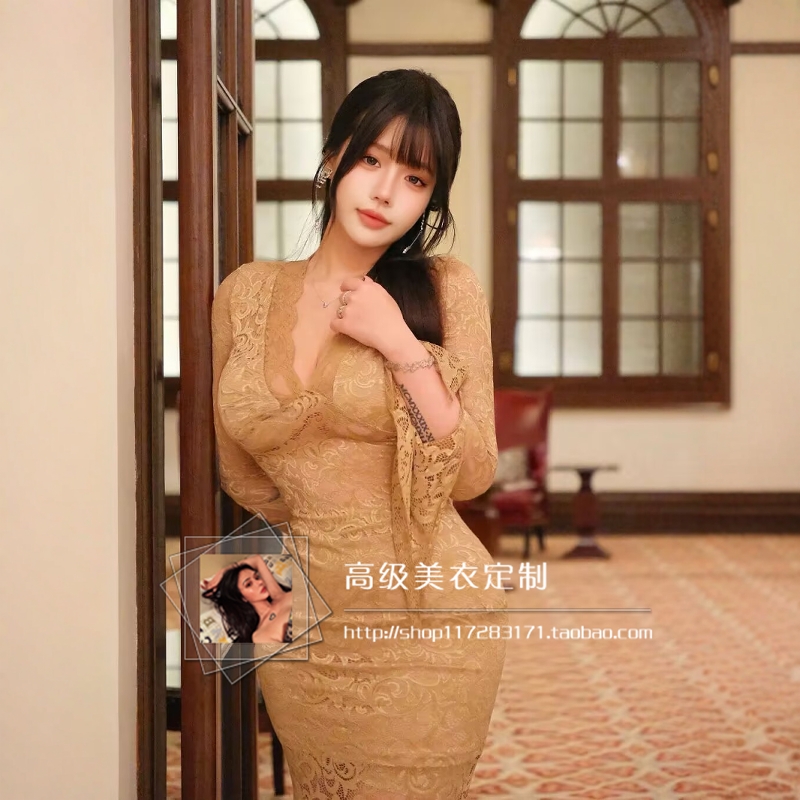 御姐性感蕾丝镂空透视喇叭袖连衣裙轻熟风V领修身包臀显身材长裙