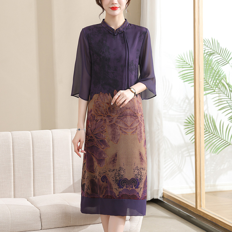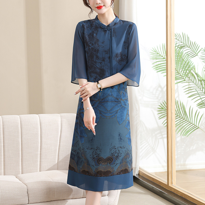 妈妈夏装气质中国风印花连衣裙中年女改良旗袍中老年显瘦遮肚裙子
