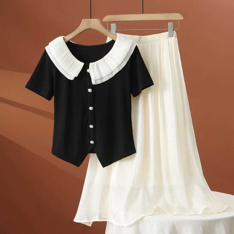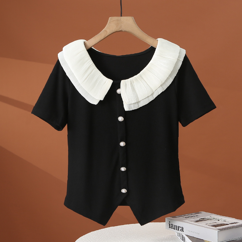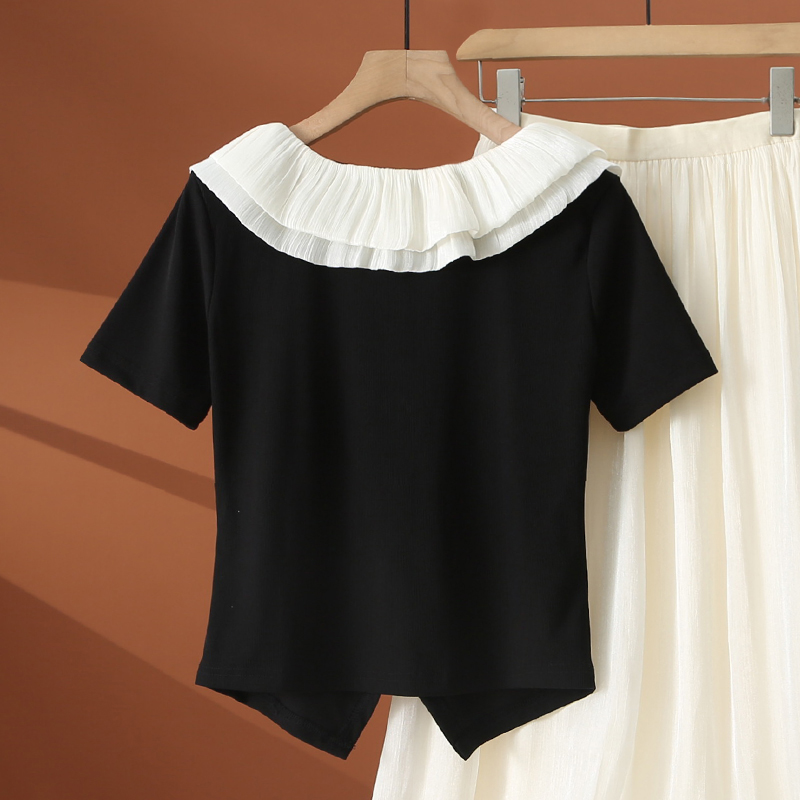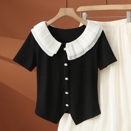 荷叶领短袖t恤女2025新款体恤衫夏季小个子修身显瘦短款黑色上衣
