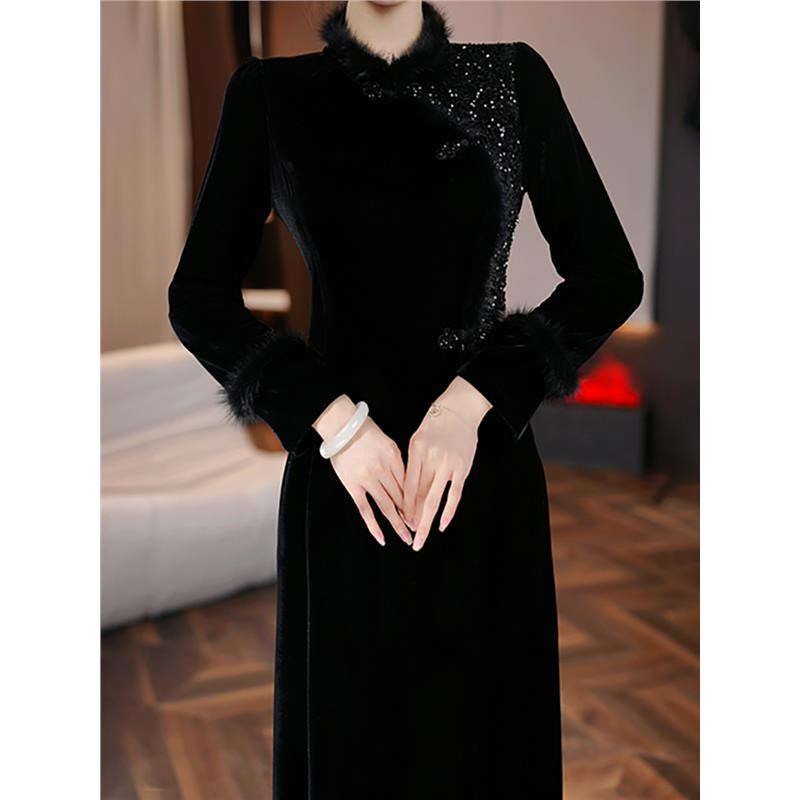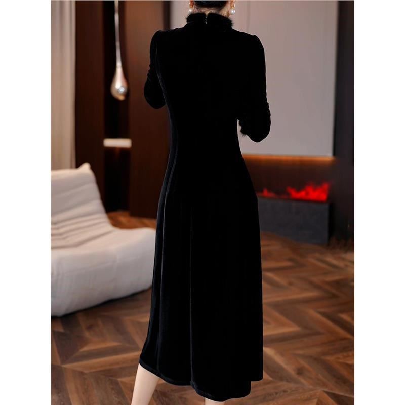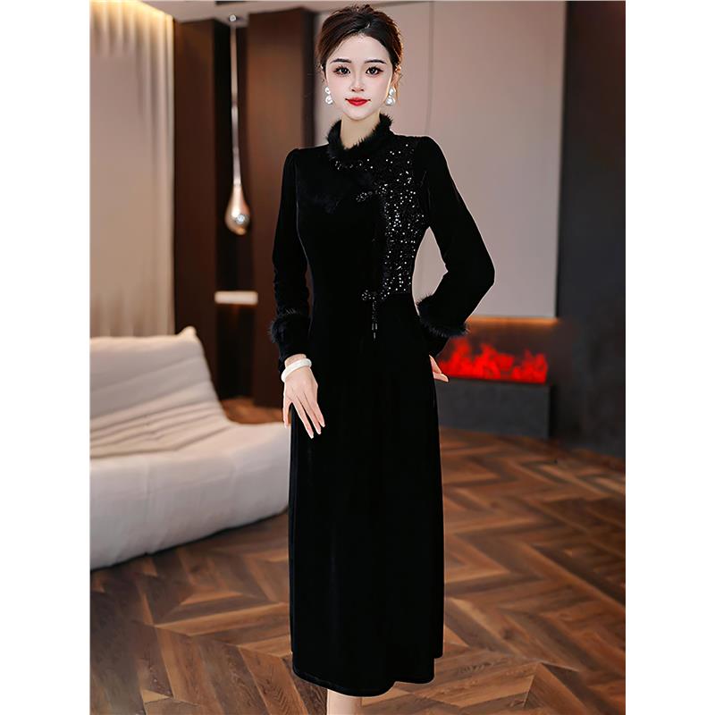 现货速发改良旗袍连衣裙2025新款秋冬季加绒加厚高端妈妈长袖配大