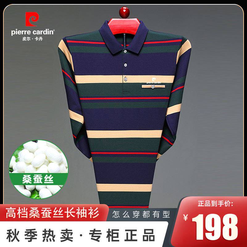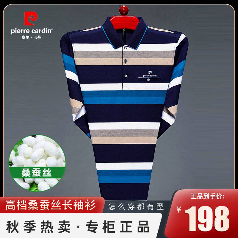 皮尔卡丹秋季新款高档男士无痕桑蚕丝长袖POLO衫中年条纹翻领T恤