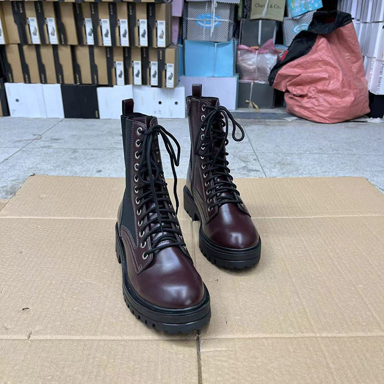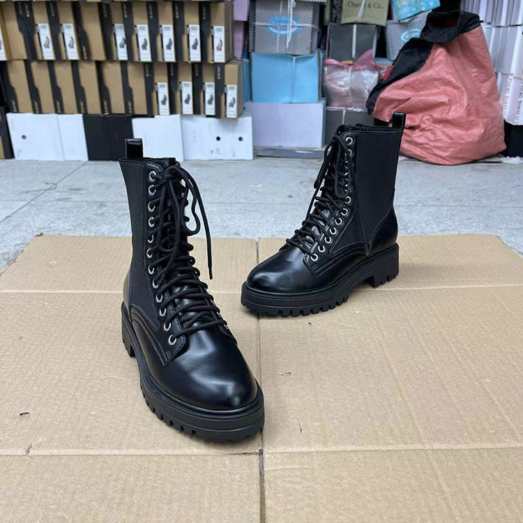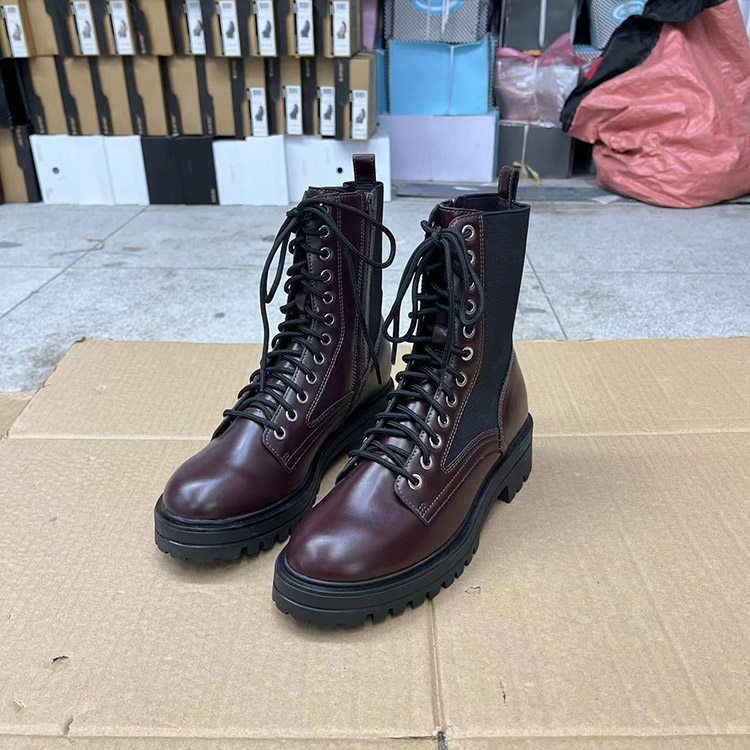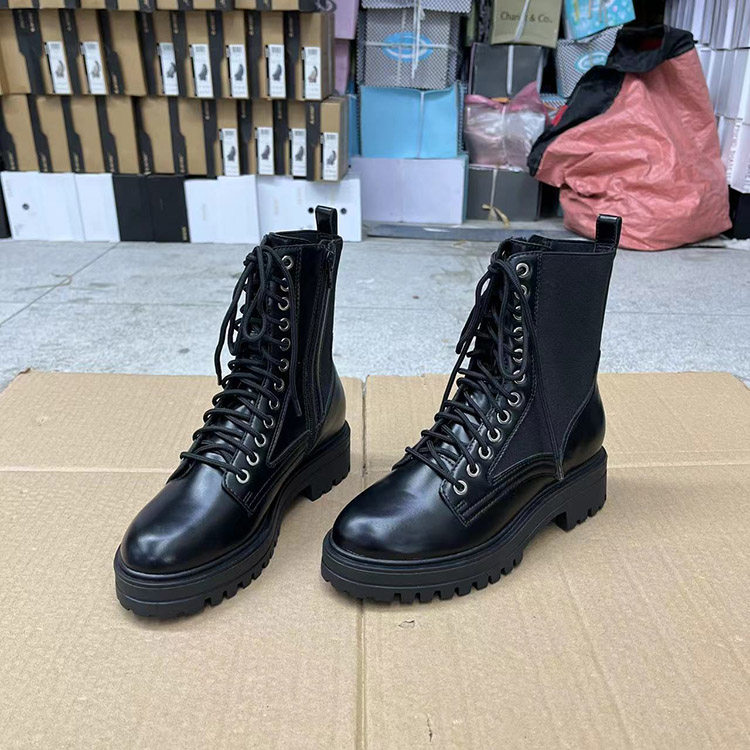外贸原单欧美时尚马丁靴复古纯色圆头平底侧拉链系带短靴骑士靴