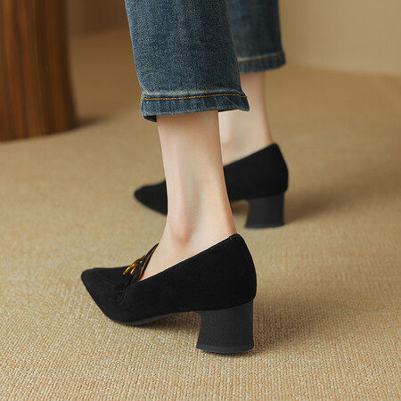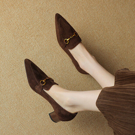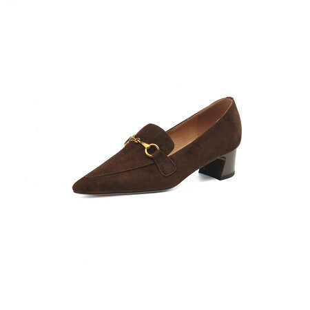 法式复古尖头深口粗跟棕色磨砂真皮中跟单鞋金属时尚百搭女高跟鞋