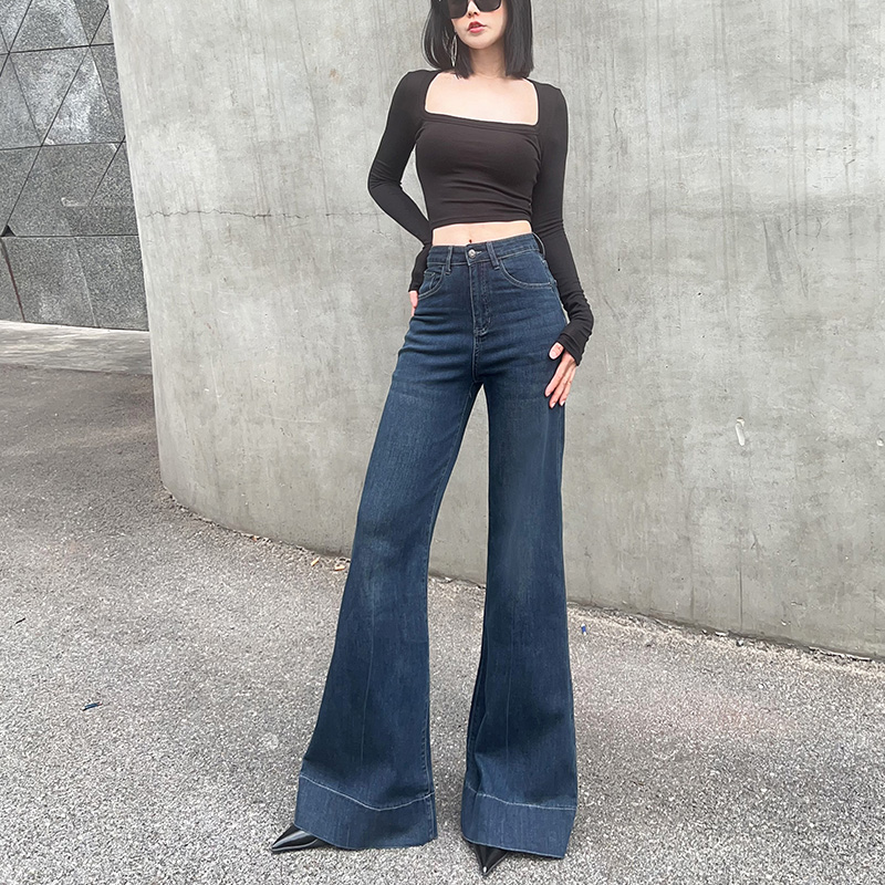 杨杨 复古深蓝色阔腿牛仔裤女秋季不贴腿宽松遮肉微喇叭宽边长裤