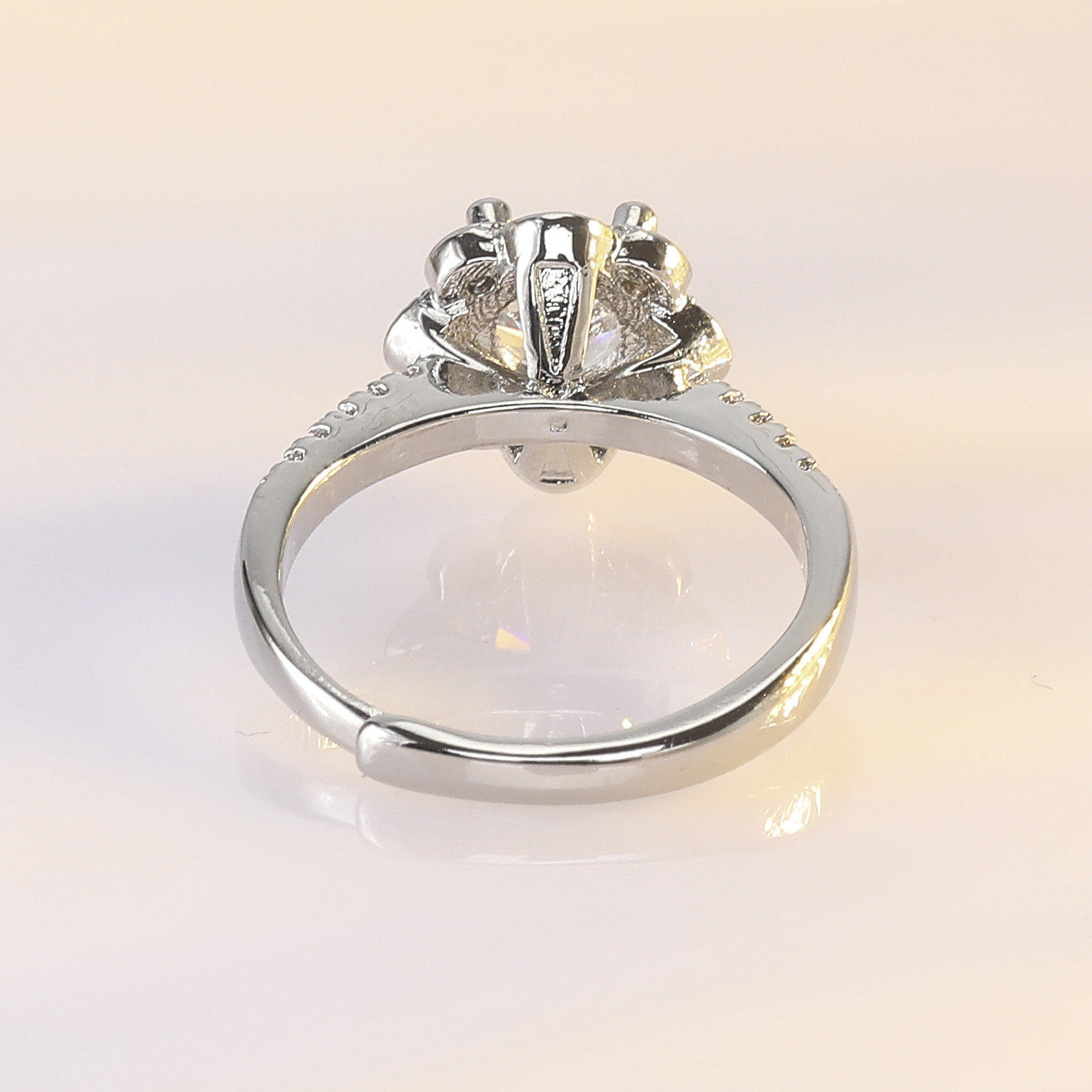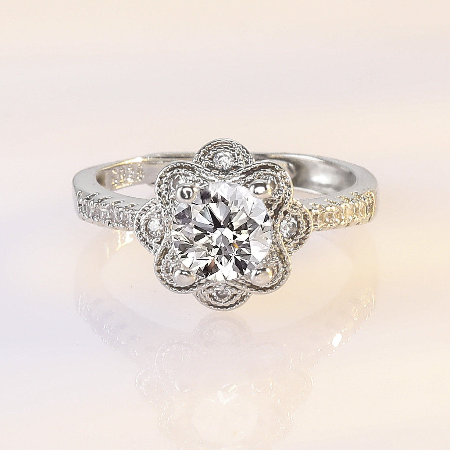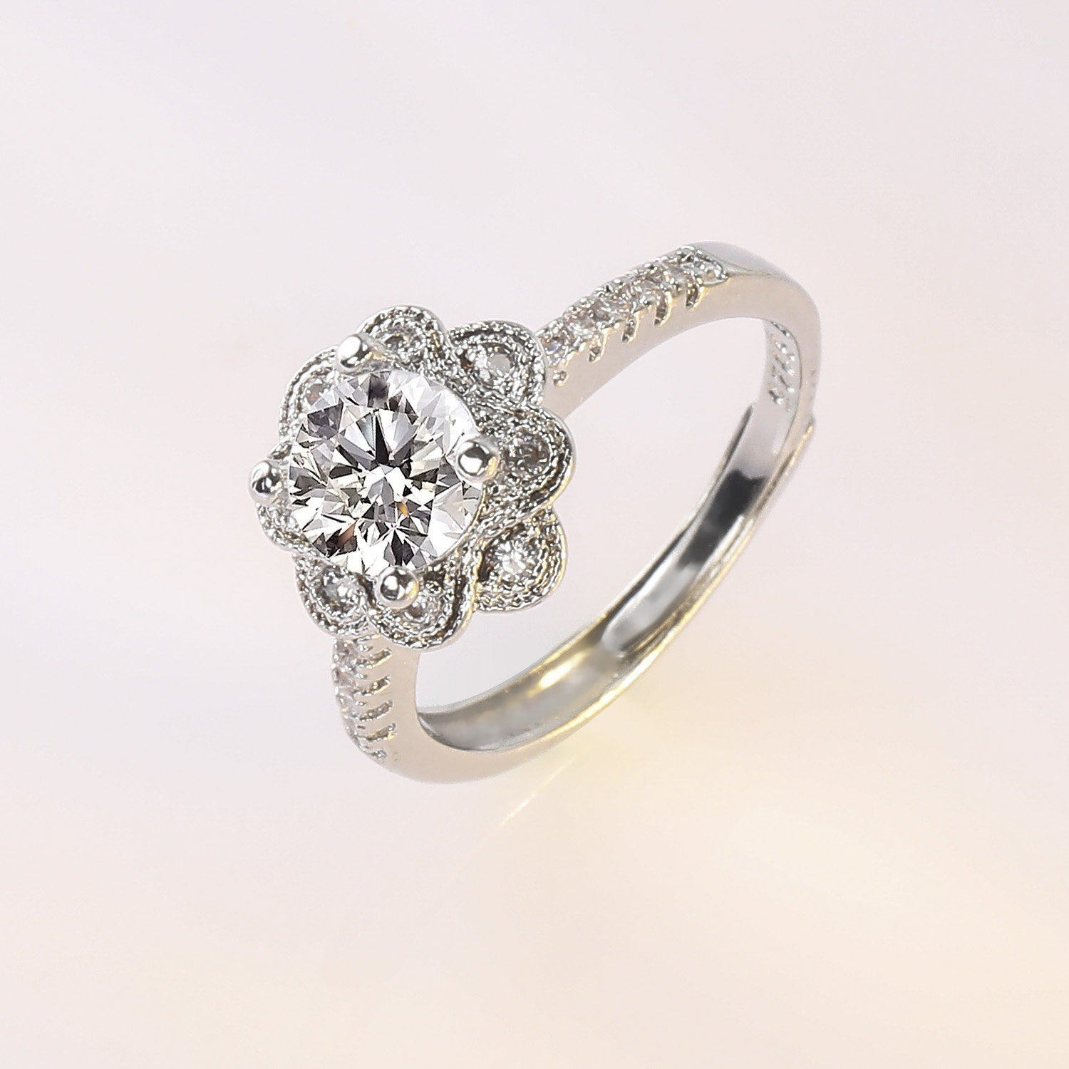 韩版时尚镀925银花朵硞石微镶戒指少女简约甜美求婚订婚结婚钻戒