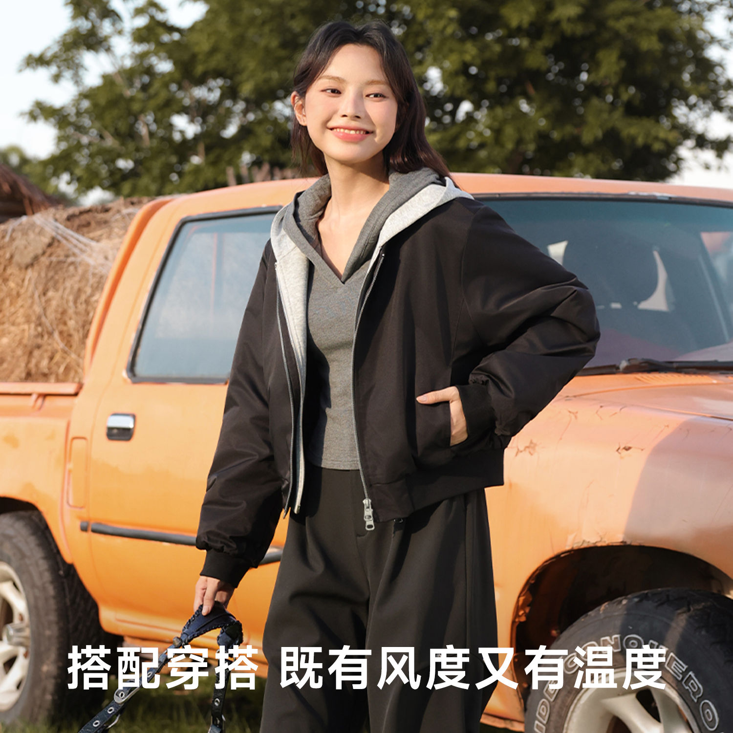 班尼路S&K系黑色假两件夹克女棉服2025秋冬新款短款夹棉外套上衣H