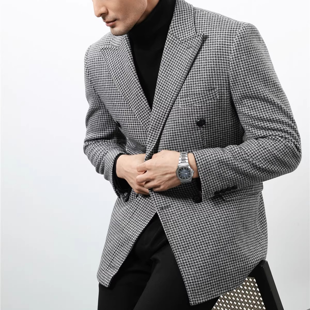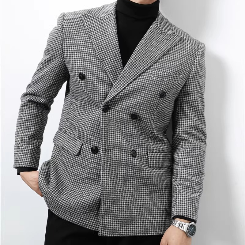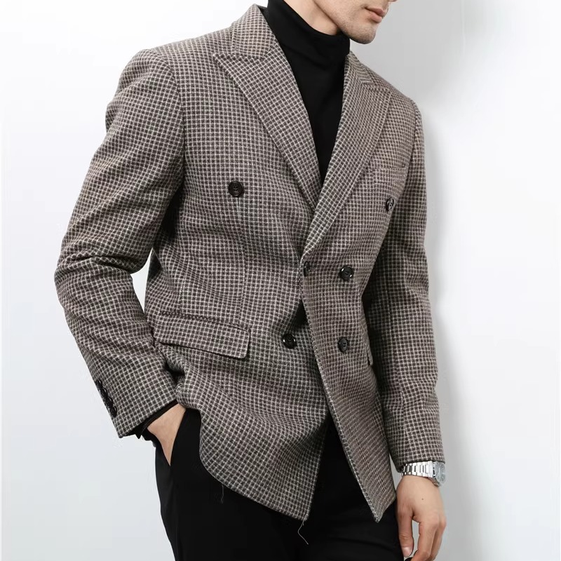 秋冬季美式复古毛呢西装外套男加厚质感高级感粗花呢双排扣单西潮