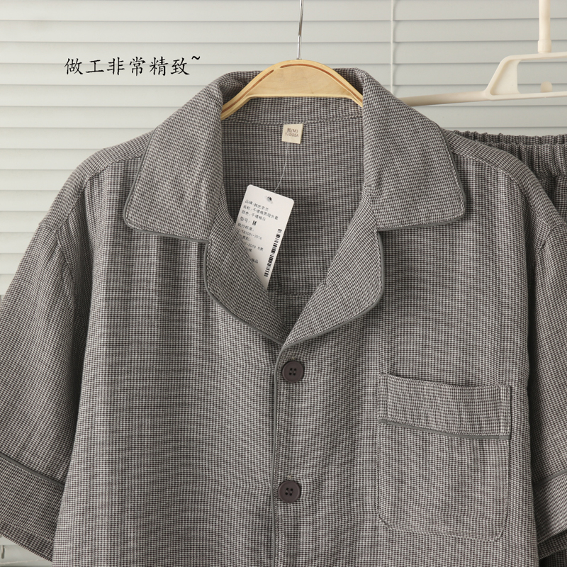 男士纯棉双层纱布开身短袖长裤家居服睡衣套装全棉透气大码夏