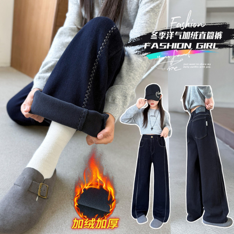 女童牛仔裤加绒秋冬2025新款韩版宽松显瘦休闲窄版直筒阔腿裤