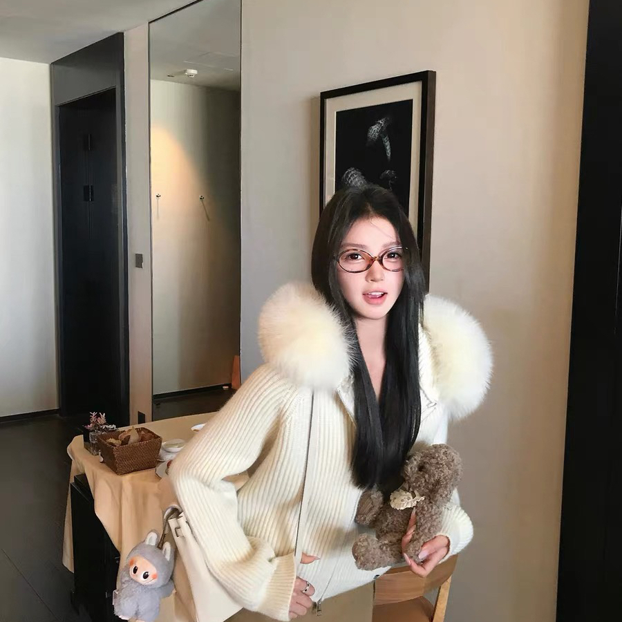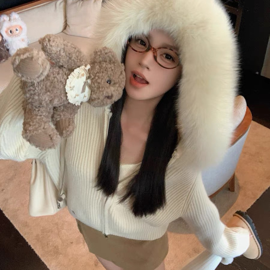 慵懒毛衣宽松气质白色针织开衫(配可拆卸毛领)