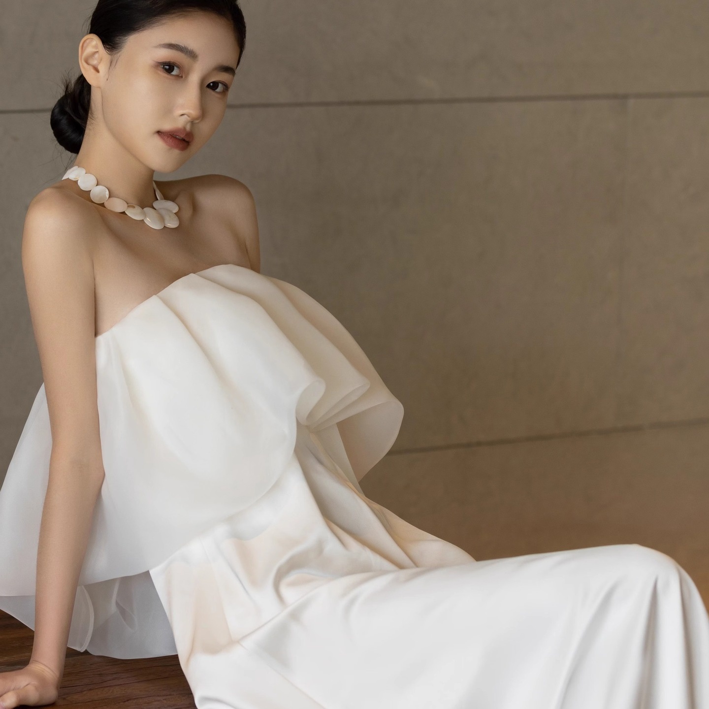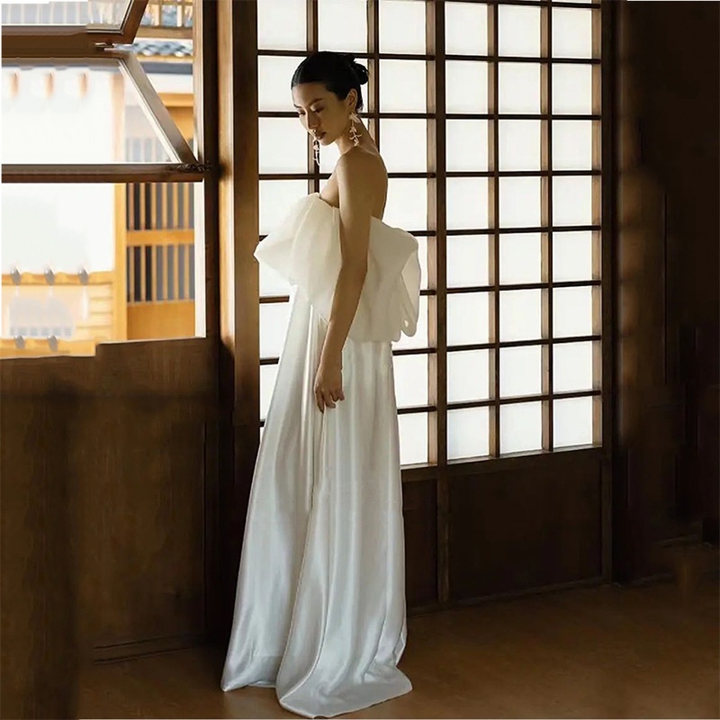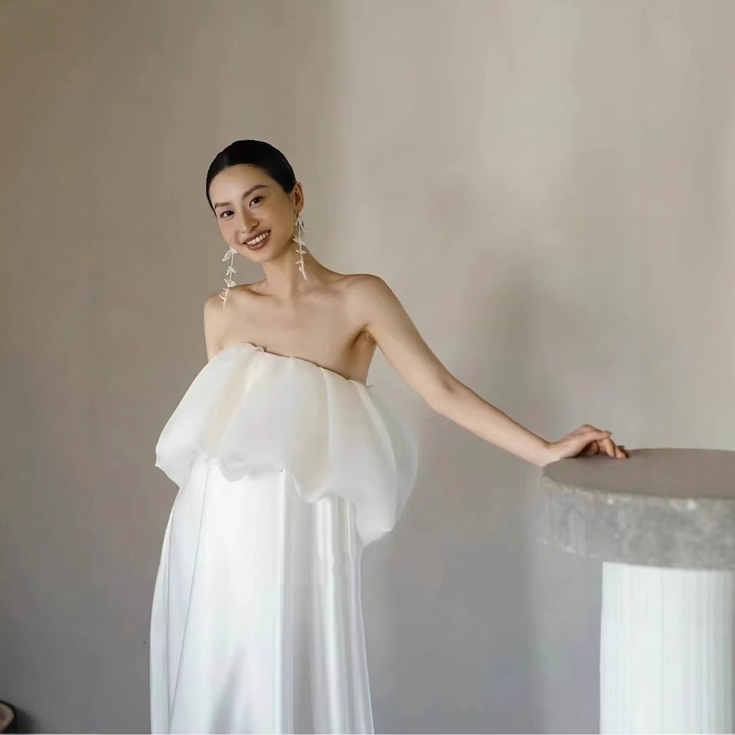 新娘白色出门纱法式缎面小众晨袍抹胸高腰轻礼服孕妇婚纱摄影