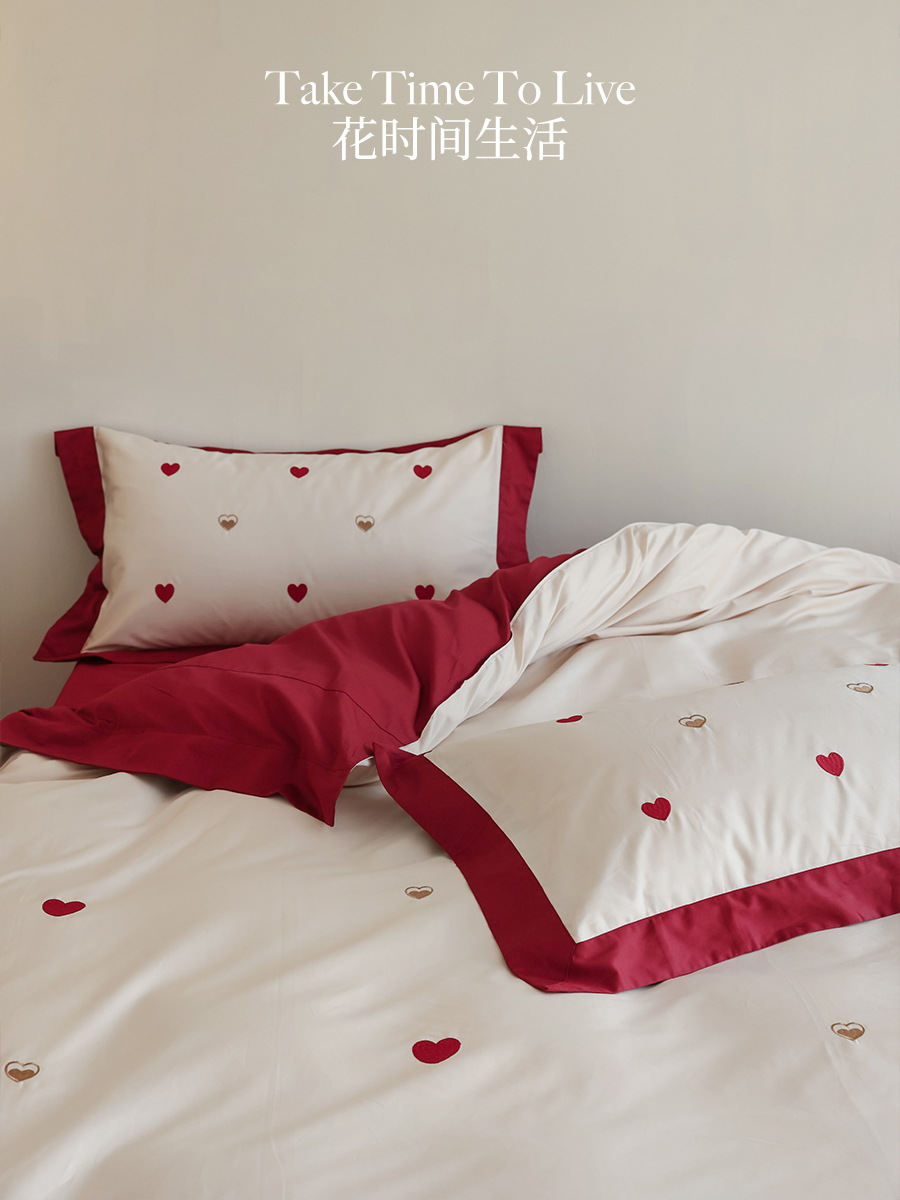 花时间生活长绒棉结婚床单四件套全棉贡缎纯棉陪嫁爱心刺绣床品