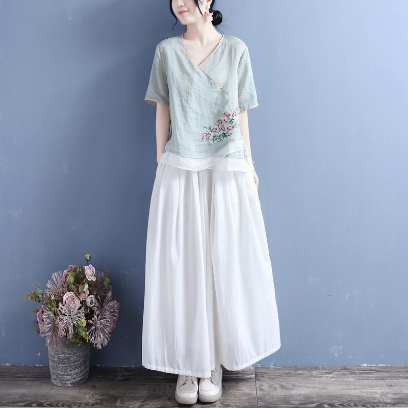 棉麻V领短袖上衣女2023夏季拼色包边假斜襟双盘扣中国风亚麻茶服