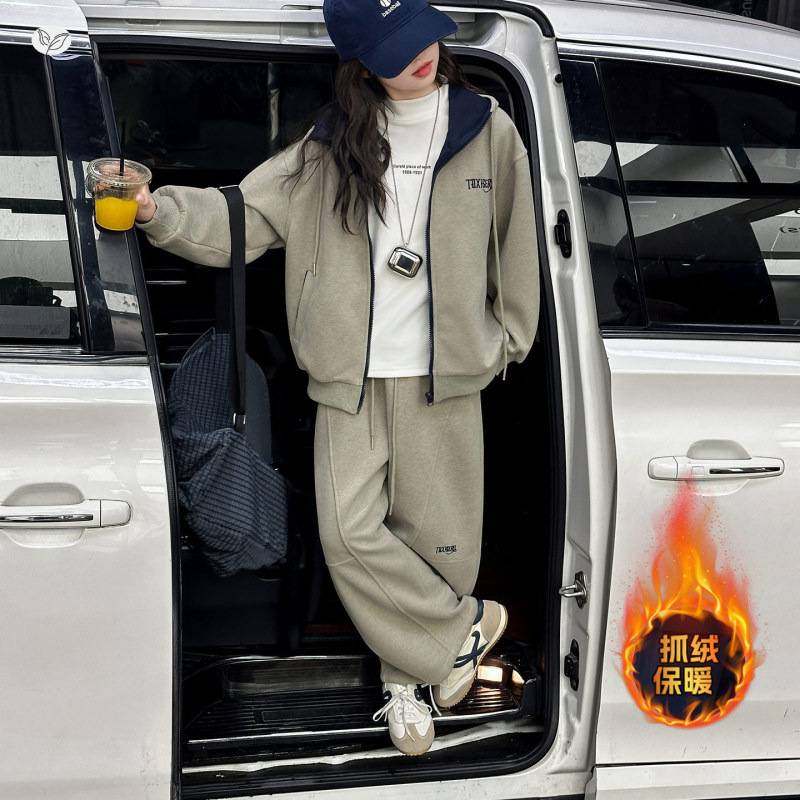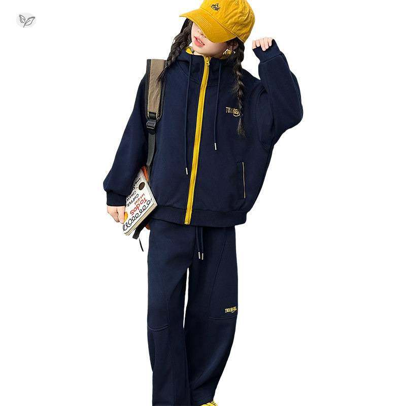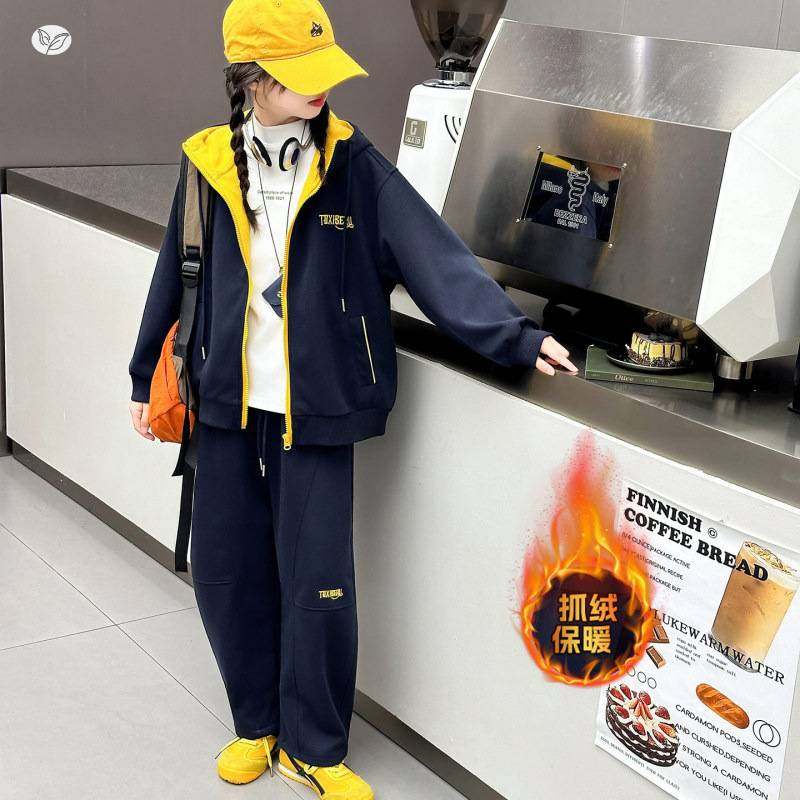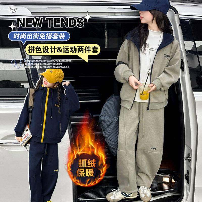 官方正品女童卫衣加绒套装2025年新款中大童撞色刺绣外套阔腿裤运