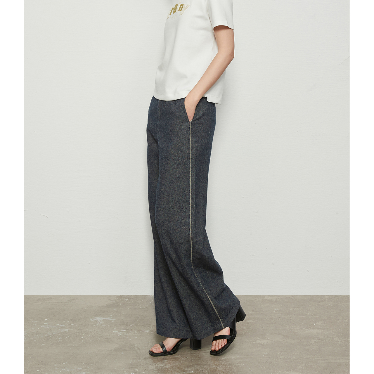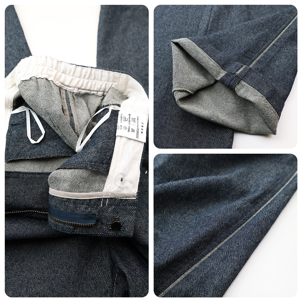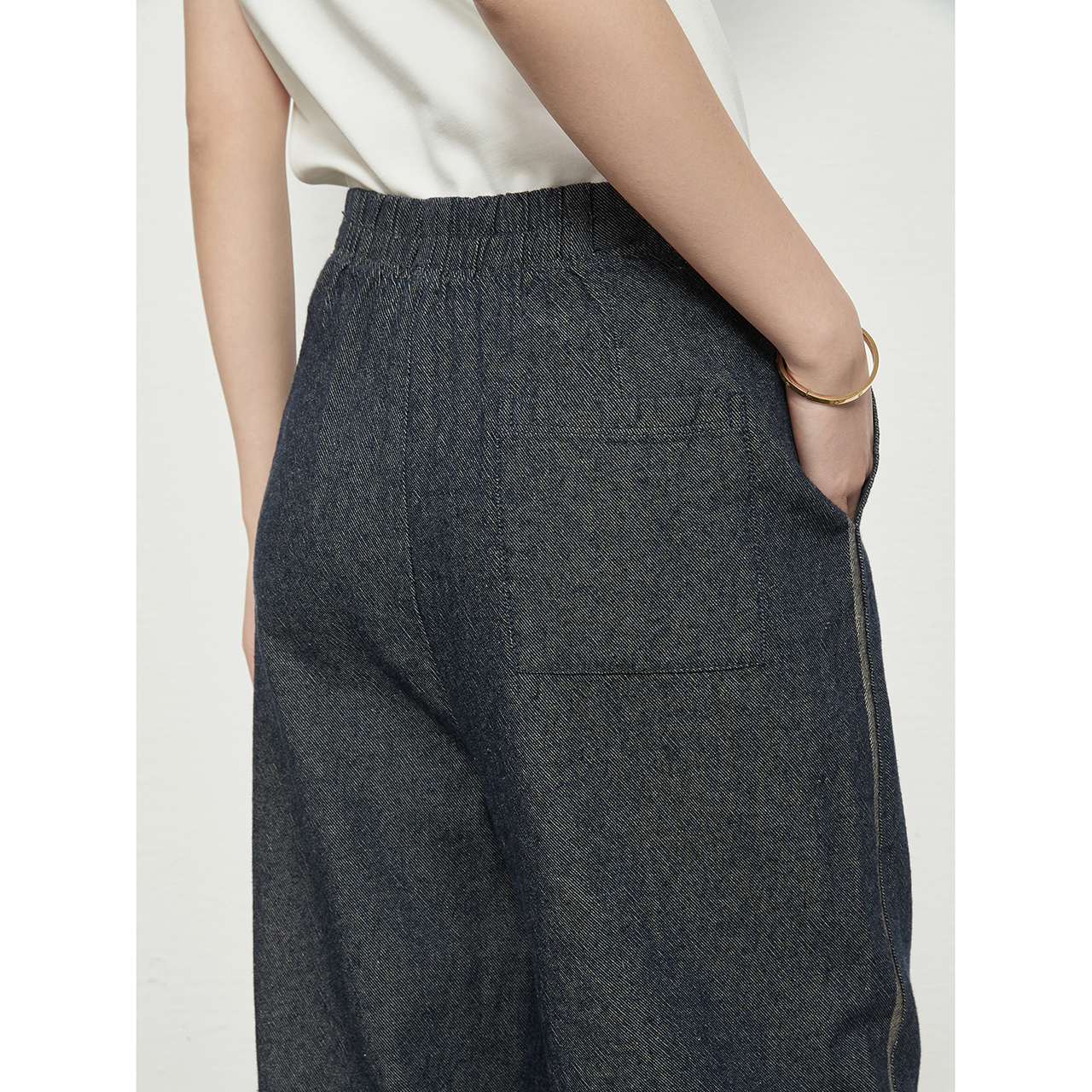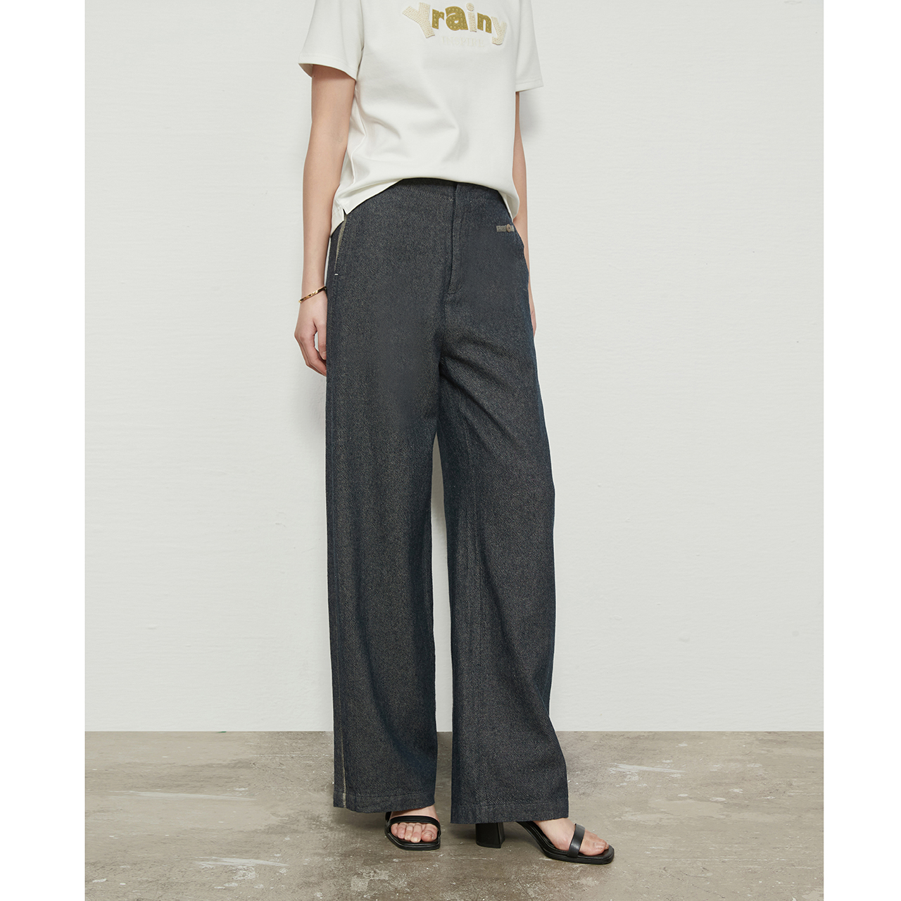 品牌新款棉亚麻色织斜纹靛青色直筒裤女精工高定长裤休闲通勤
