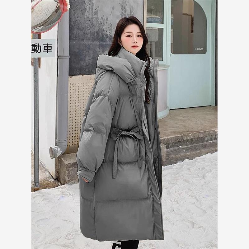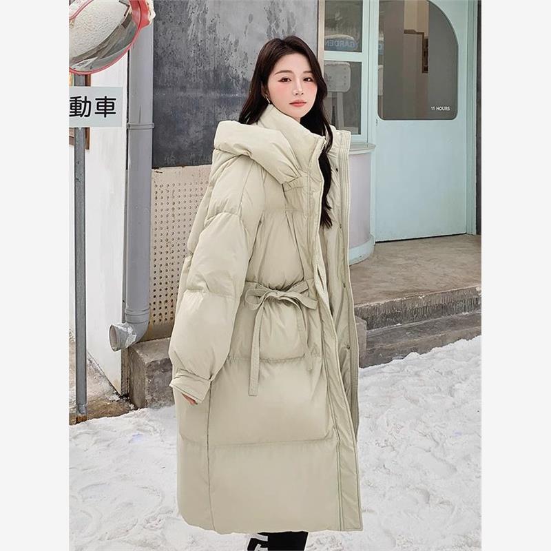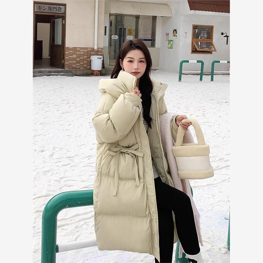 蝴蝶结2024冬新款羽绒服女中长款韩版连帽宽松休闲保暖白鸭绒外套